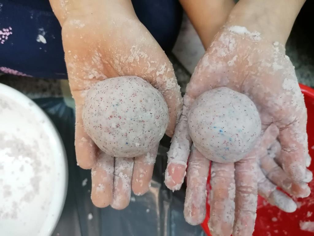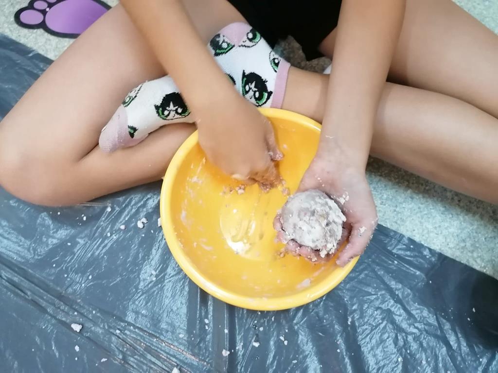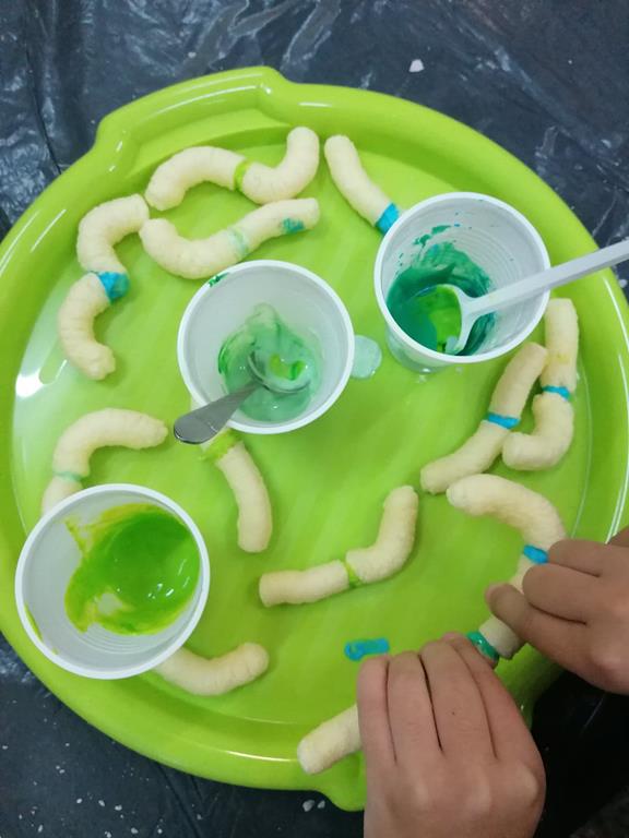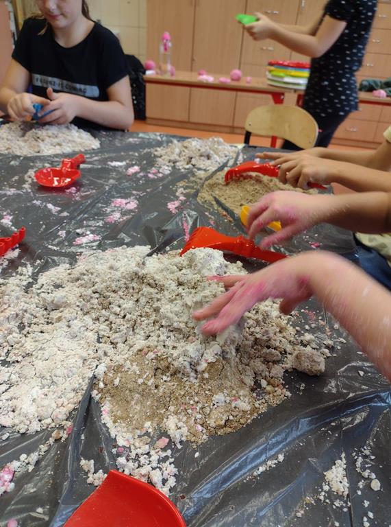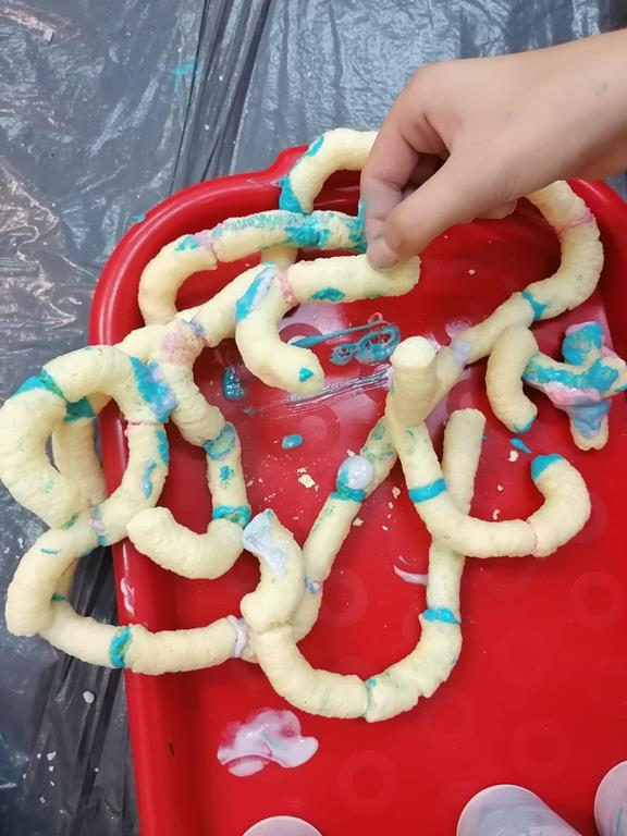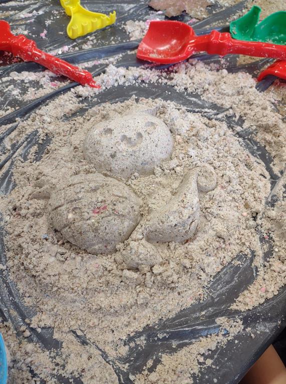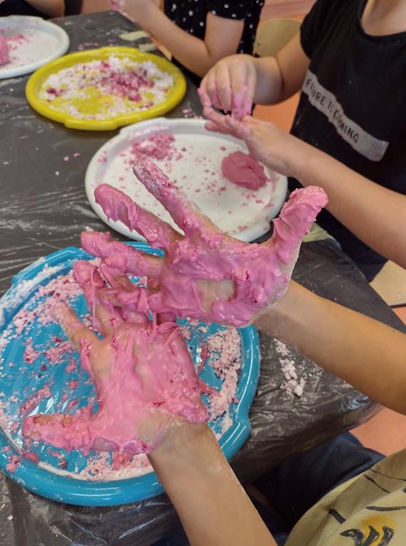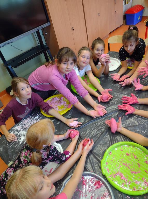 Na zajęciach z plastyki sensorycznej, które są prowadzone przez p. Bernadetę Kucharską i p. Magdalenę Lewartowską dzieci łączą świetną zabawę z wszechstronnym rozwojem, ponieważ całym ciałem doświadczają aktywności: brudzą się, tworzą rozmaite masy plastyczne, piasek kinetyczny, smakują, dotykają i wąchają, a przede wszystkim mają niebywałą okazję poznać niekonwencjonalne środki wyrazu. Mogą eksperymentować, a co najważniejsze: dobrze się bawić i relaksować.