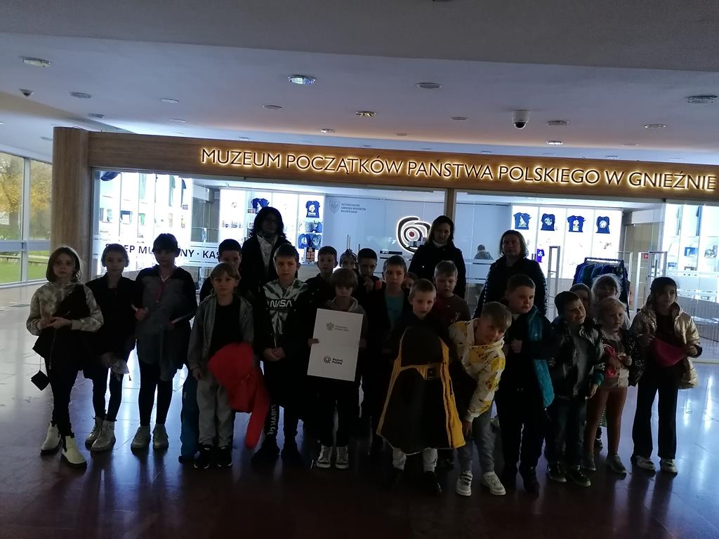 Dnia 18 października 2022r. uczniowie klas I – III wzięli udział w wycieczce do Biskupina i Gniezna dofinansowanej przez rządowe przedsięwzięcie Ministra Edukacji i Nauki pn. „Poznaj Polskę” . Celem wycieczki było poznanie miejsc i zabytków związanych z początkami państwa polskiego, zainteresowanie i zaciekawienie uczniów historią Polski, zdobywanie wiedzy historycznej poprzez obserwację i doświadczanie. Wyprawę rozpoczęto od zwiedzania Rezerwatu Archeologicznego, rekonstrukcji osady pierwszych Piastów na tych ziemiach w Biskupinie. Po obejrzeniu długich, drewnianych zabudowań uczniowie z opiekunami obejrzeli obozowisko łowców i zbieraczy z epoki kamienia oraz wioskę wczesnopiastowską. Podczas zwiedzania osiedla obronnego ludności łużyckiej w zrekonstruowanych chatach czekali rzemieślnicy prezentujący swoje wyroby m.in. broń, szaty i narzędzia. Po spacerze uczniowie uczestniczyli w lekcji muzealnej - „Zostań mieszkańcem pradziejowej osady – o życiu codziennym w epoce brązu”. Następnym punktem zwiedzania było Gniezno , gdzie grupa przeszła do Muzeum Początków Państwa Polskiego na lekcję - ,,Jak żyli ludzie 1000 lat temu?’’. Uczniowie poznali dawne narzędzia, ciekawostki z życia ludzi. Po dniu pełnym wrażeń wycieczka dobiegła końca, a uczniowie bogatsi o kolejne doświadczenia i wiedzę, szczęśliwie wrócili do domów.