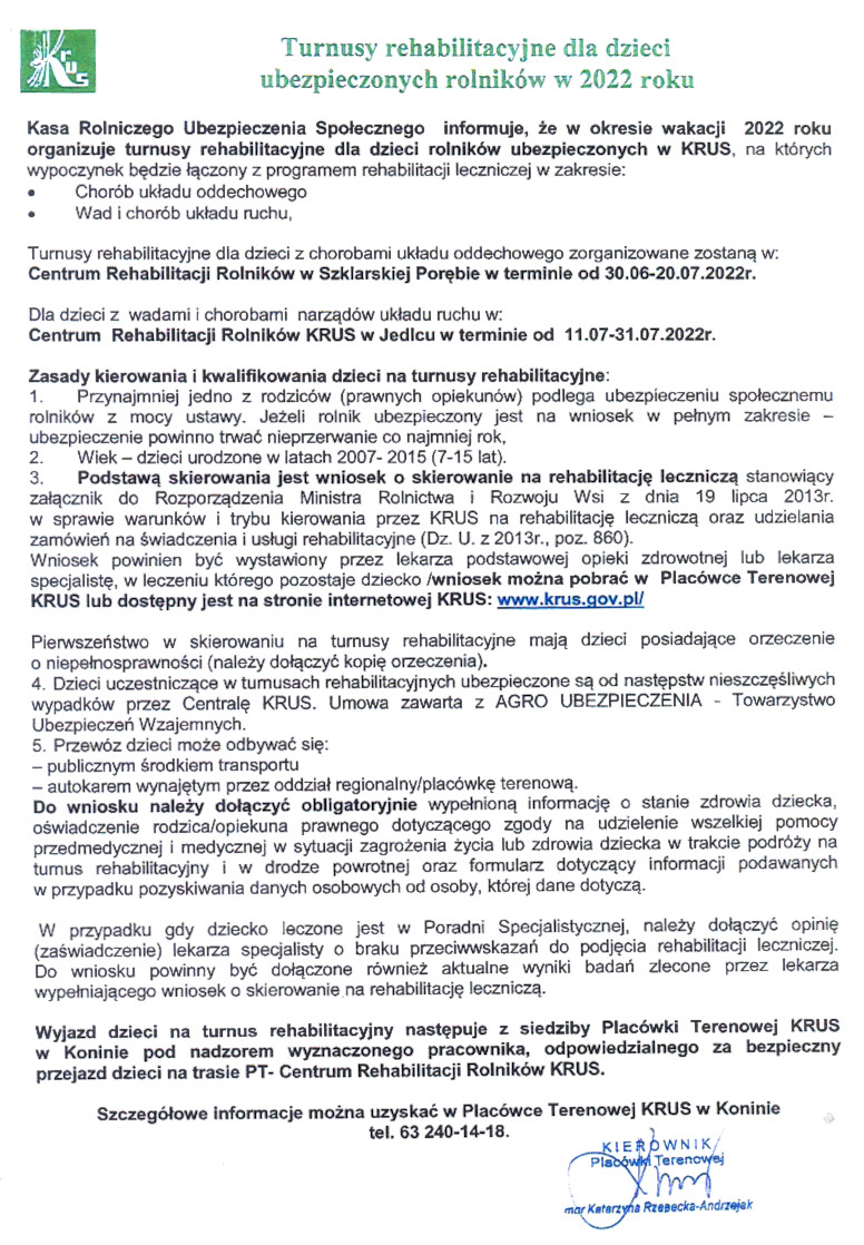 Placówka Terenowa KRUS w Koninie przekazuje informację o możliwości wyjazdu na turnus rehabilitacyjny dzieci ubezpieczonych rolników. Szczegółowe informacje dostępne są w Placówce Terenowej KRUS w Koninie tel. 63 240 14 18