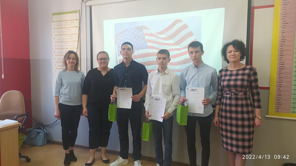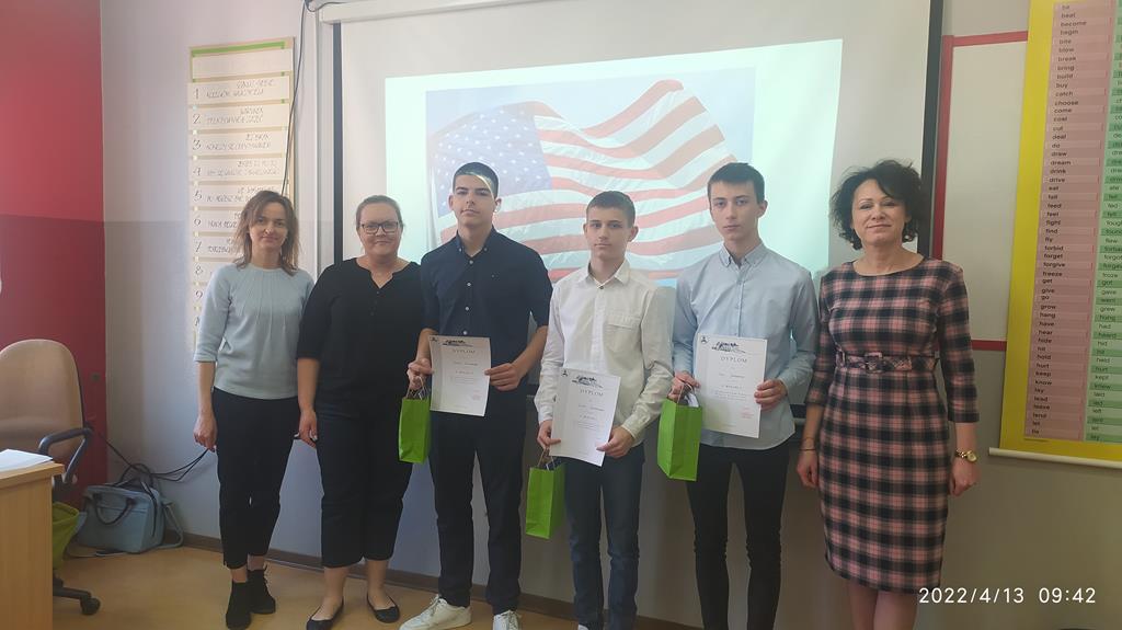 13 kwietnia 2022 roku nasza trzyosobowa drużyna z klasy VIII w składzie Filip Jaśkiewicz, Piotr Smuśkiewicz oraz Jakub Zborowski wzięła udział i zajęła II miejsce w IX MIĘDZYSZKOLNYM KONKURSIE WIEDZY O KULTURZE STANÓW ZJEDNOCZONYCH, który odbył się w Zespole Szkół Centrum Kształcenia Ustawicznego im. Stefana Batorego w Koninie . W konkursie wzięły udział cztery szkoły z regionu konińskego. Nasza drużyna miała jednakową ilość poprawnych odpowiedzi jak drużyna z I miejsca. O przyznanym miejscu zdecydowała szybkość udzielanych odpowiedzi. Konkurs miał na celu zaprezentować umiejętności językowe uczniów oraz wiedzę o kulturze Stanów Zjednoczonych . Test składał się z 39 pytań w języku angielskim. Tematyka konkursu obejmowała: muzykę, sport, film, rodzinę, dom, obyczaje związane ze świętami, kuchnię, znane postaci, symbole narodowe, edukację, ustrój polityczny, historię. Konkurs został przeprowadzony za pomocą aplikacji Kahoot! Nasi uczniowie uczciwie realizowali z pozostałymi drużynami oraz doskonale współpracowali w swojej grupie.