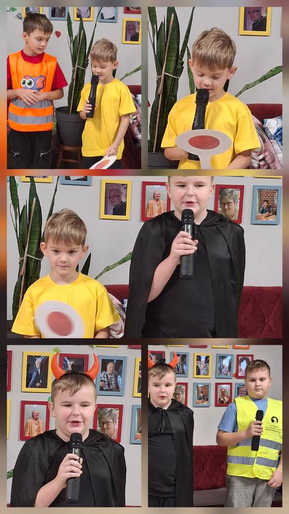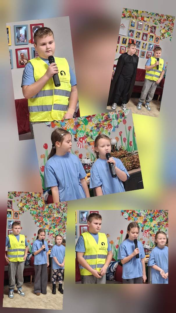Na zakończenie naszego projektu „Odblaskowa Szkoła” młodzi aktorzy ze szkolnego kółka aktorskiego odwiedzili Dom Seniora w Golinie, gdzie zaprezentowali krótkie przedstawienie dotyczące bezpieczeństwa na drodze oraz znaczenia noszenia odblasków.