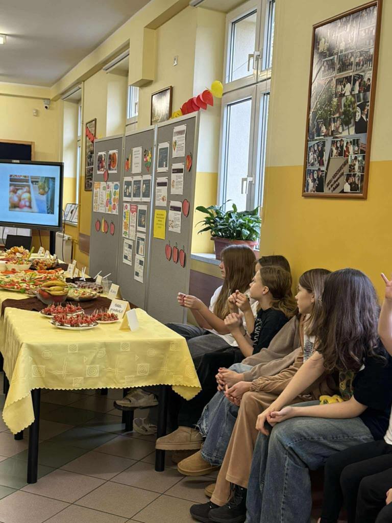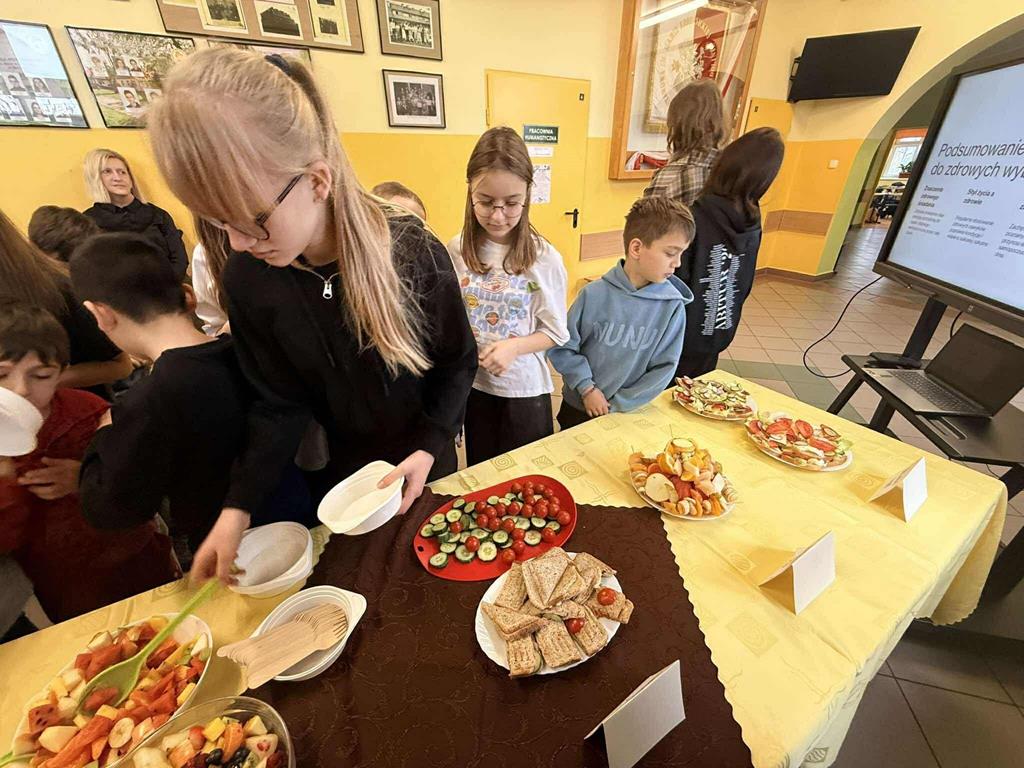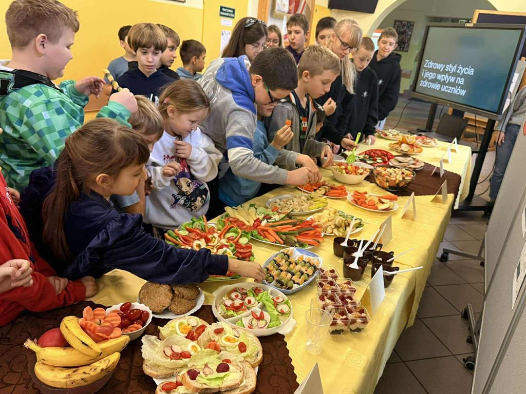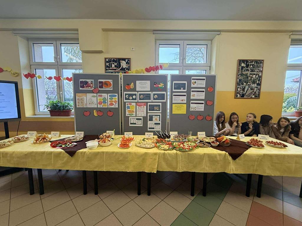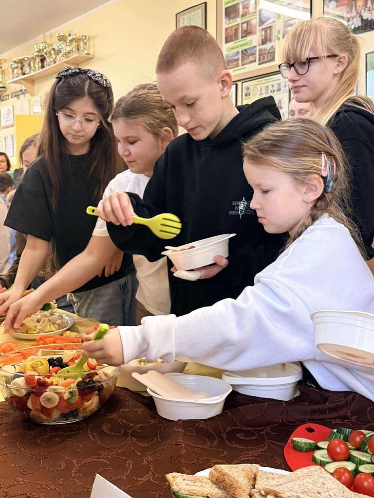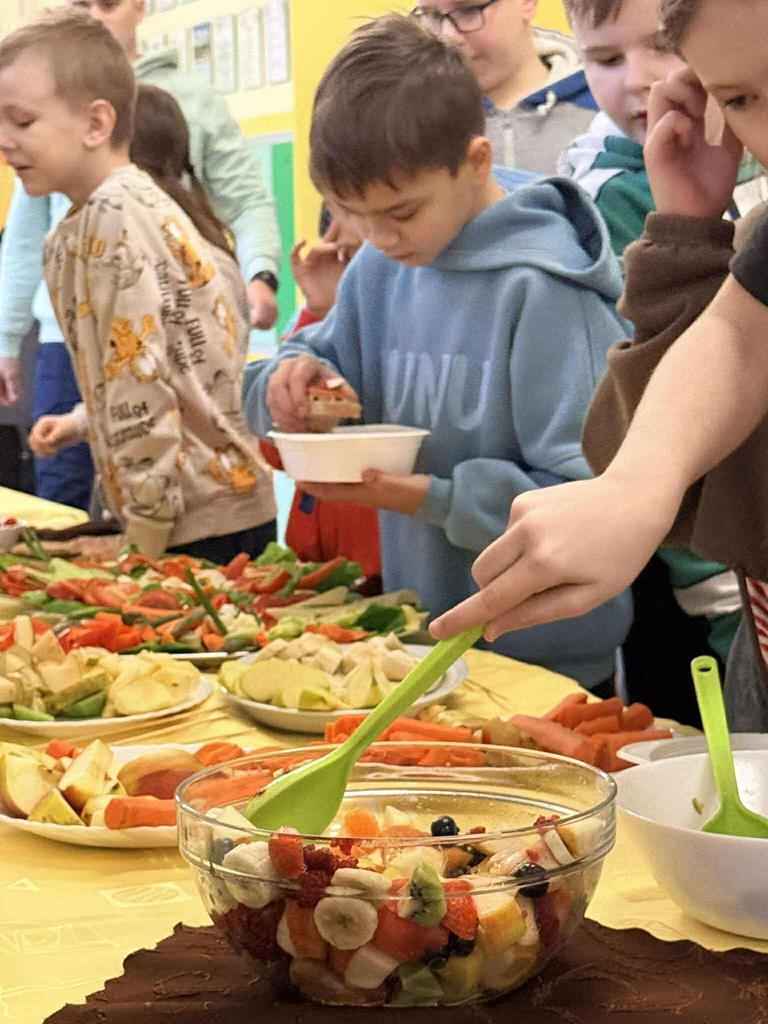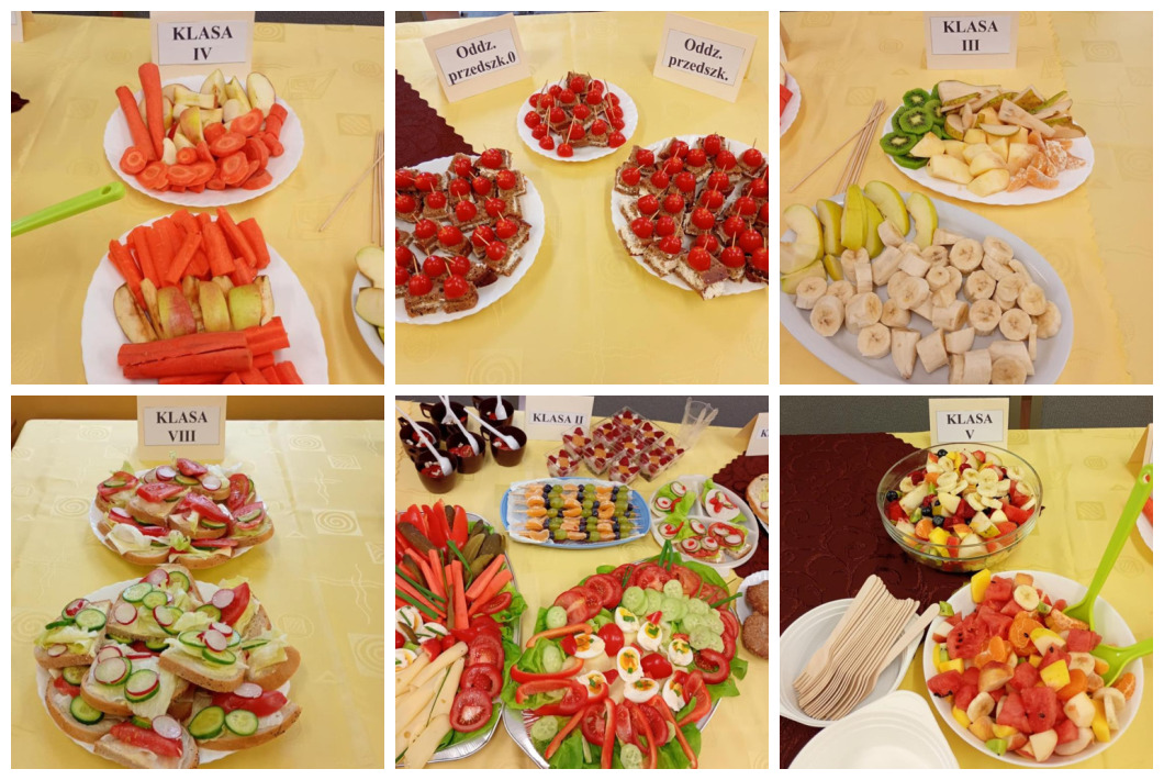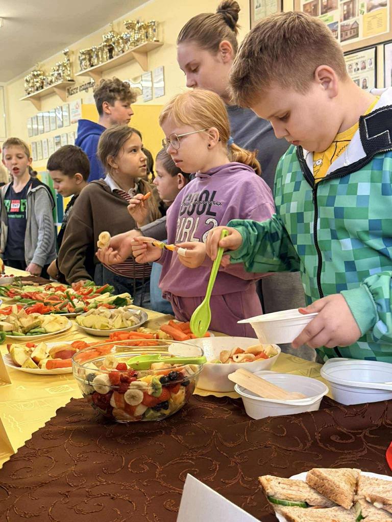 Po zakończeniu przygotowań wszystkie klasy wystawiły swoje śniadaniowe propozycje na długim stole ustawionym na szkolnym korytarzu. Barwne talerze i miski przyciągały wzrok, a zapach świeżych owoców i warzyw unosił się w całej szkole.