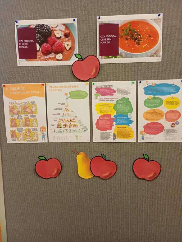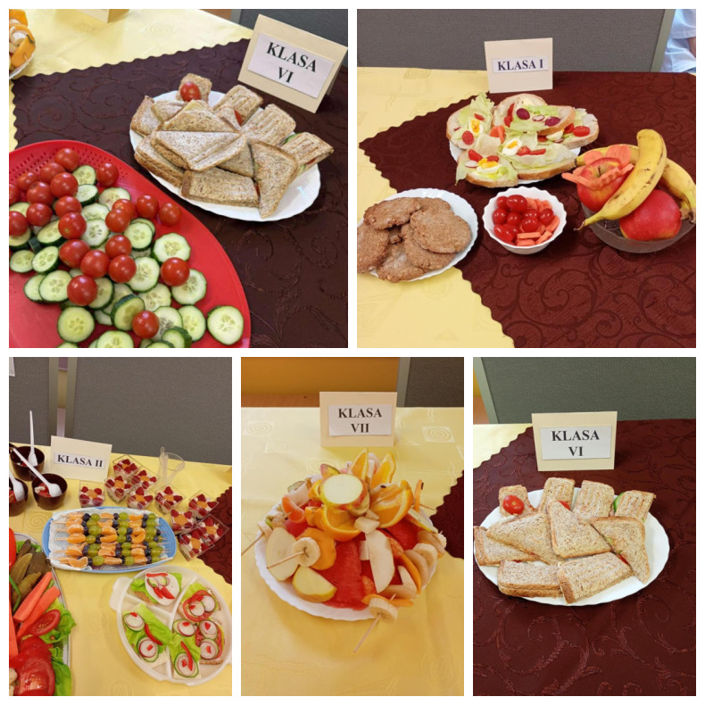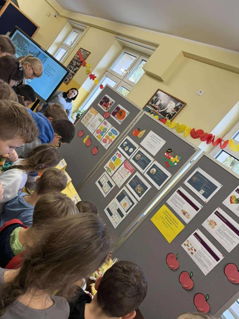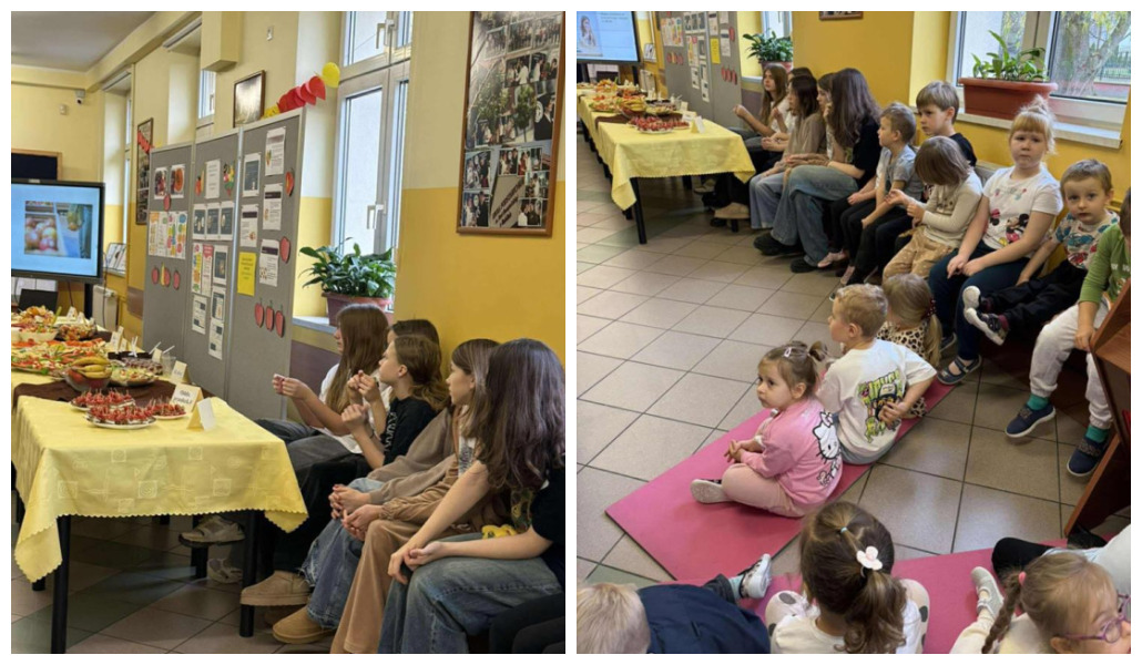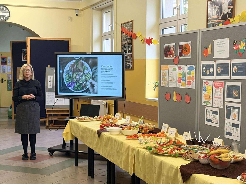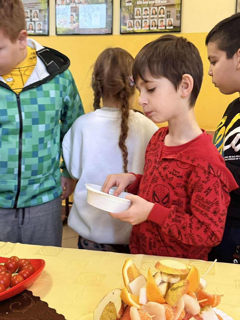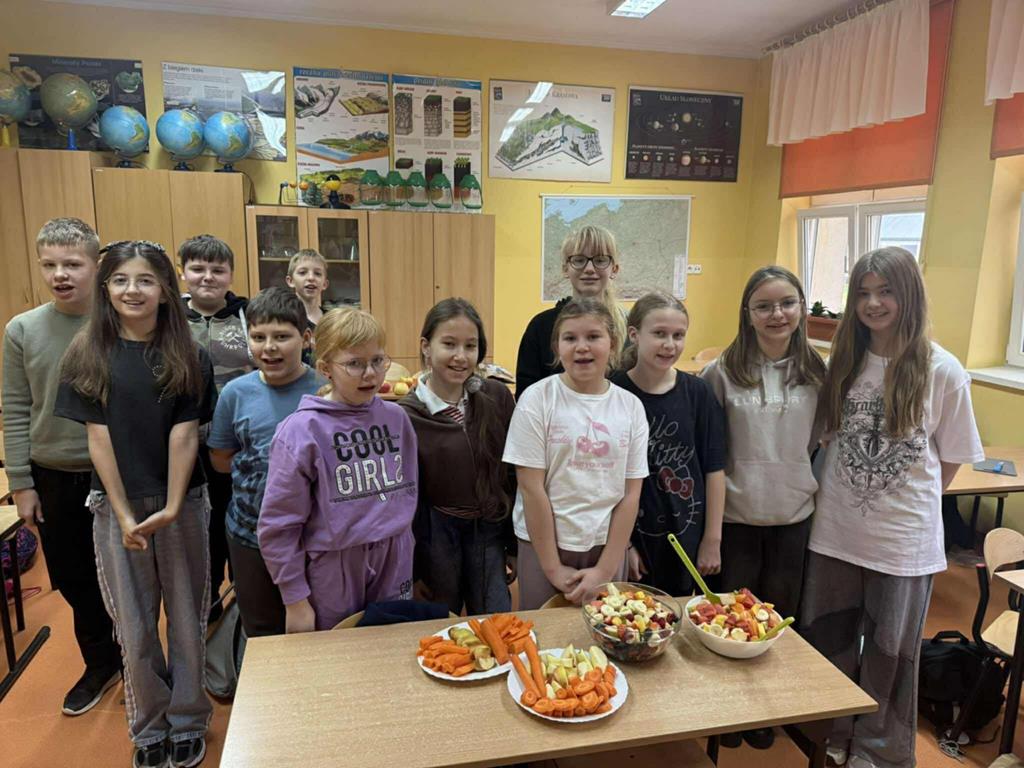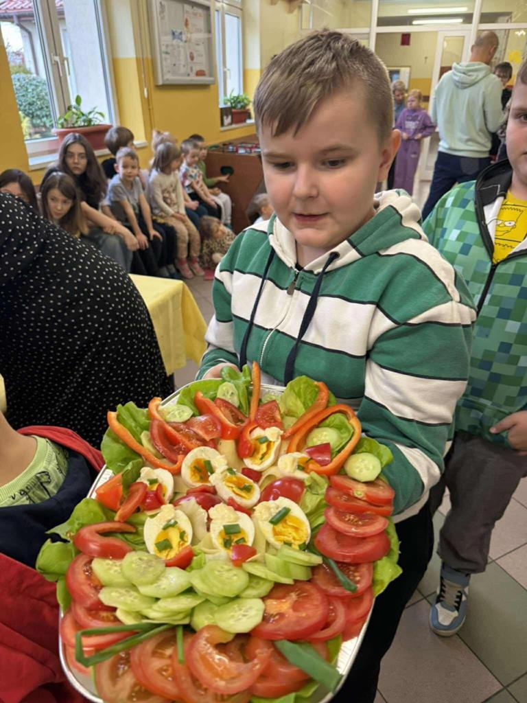 Po zakończeniu przygotowań wszystkie klasy wystawiły swoje śniadaniowe propozycje na długim stole ustawionym na szkolnym korytarzu. Barwne talerze i miski przyciągały wzrok, a zapach świeżych owoców i warzyw unosił się w całej szkole.