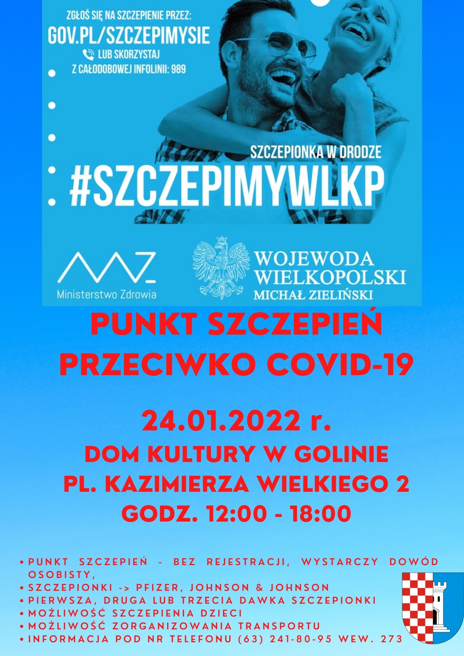 24.01.2022 r. w godz. 12.00-1.008 w Domu Kultury w Golinie będzie możliwość zaszczepienia się przeciwko COVID-19.