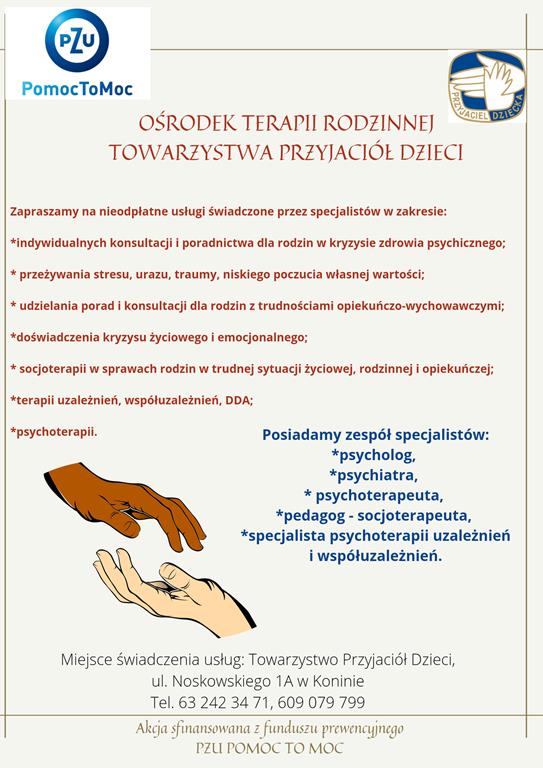 Uprzejmie informuję, że Towarzystwo Przyjaciół Dzieci w Koninie realizuje projekt w zakresie wspierania rodzin, dzieci, uczniów i zaprasza do skorzystania z nieodpłatnych usług świadczonych przez specjalistów: psychologa, pedagoga, mediatora w zakresie: