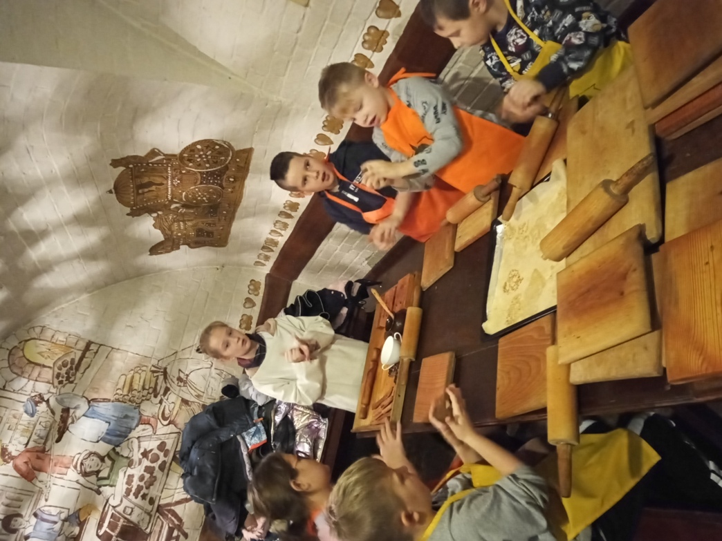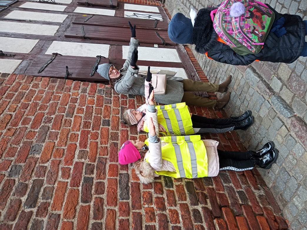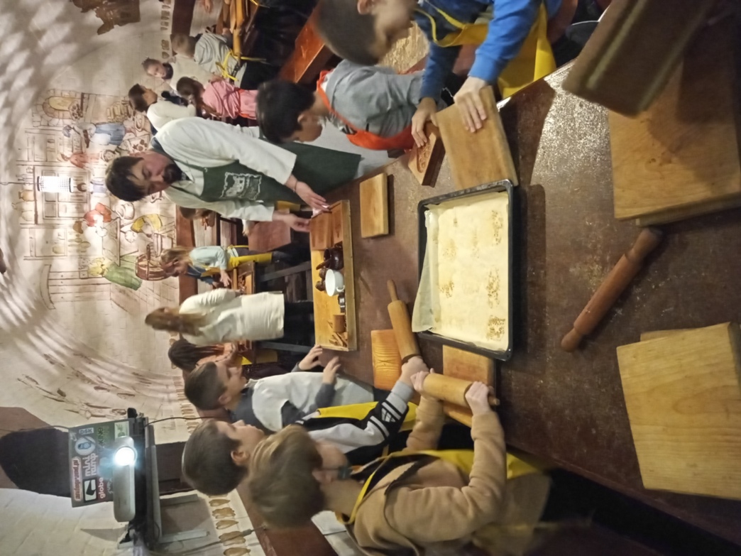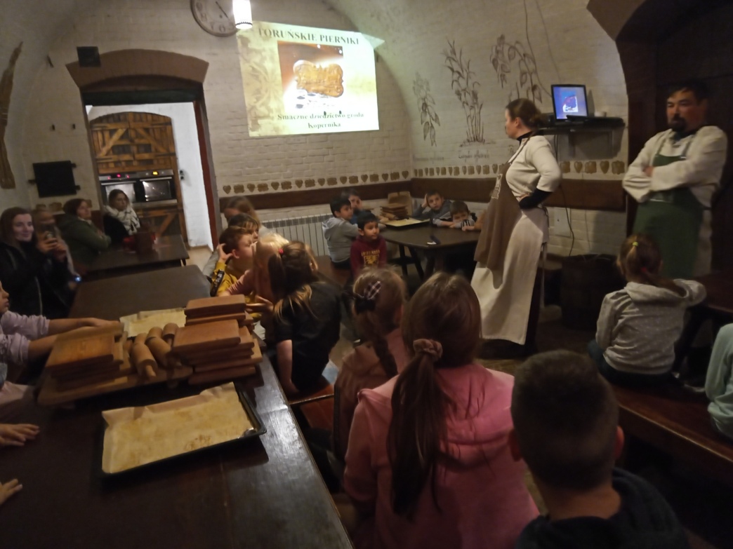 Następnie przejechaliśmy autokarem do Fortu IV- to przykład doskonale zachowanego obiektu fortecznego zewnętrznego pierścienia Twierdzy Toruń z końca XIX wieku. Dzięki wyjątkowej atmosferze tego miejsca mogliśmy się przenieść w czasie do wieku pary i telegrafu. Trasa zwiedzania wiodła poprzez część koszarową podziemnymi tunelami do części bojowej, w której można zobaczyć stanowiska ochrony dna fosy. Absolutnym hitem dla dzieci było zwiedzanie Fortu pod komendą pruskiego żołnierza. Jednak największą atrakcją było pieczenie pierników. W Forcie odbyły sie warsztaty na których wcieliliśmy się w fortecznych kuchcików i pod czujnym okiem mistrzów cechowych zrobiliśmy (być może pierwszy w swoim życiu) piernik dekoracyjny. Tutaj powitała nas pani przebrana w strój z epoki, w której żył Kopernik i wyjaśniła, z jakich produktów składają się pierniki. Pomogła nam też podczas własnoręcznego wypieku pierników według starych, tradycyjnych receptur. Warsztatom towarzyszyła prezentacja, konkurs oraz poczęstunek toruńskimi pierniczkami.