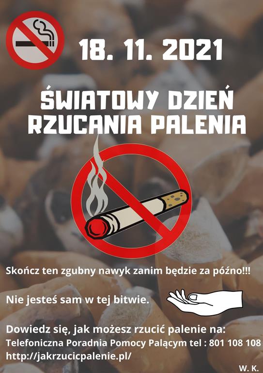 Światowy Dzień Rzucania Palenia obchodziliśmy w naszej szkole w trzeci czwartek listopada. Wcześniej, bo w poniedziałek na lekcjach wychowawczych nauczyciele przedstawili uczniom prezentację o szkodliwości palenia tytoniu i sposobach zerwania