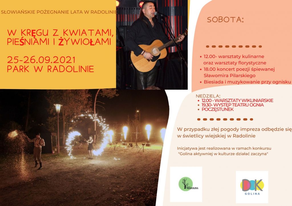 Wielkopolskie Stowarzyszenie Odnowy Wsi Nasza Radolina proponuje mieszkańcom Radoliny, okolicznych wiosek oraz całej gminy Golina, by na dwa dni przenieśli się w przeszłość i poczuli się jak nasi praojcowie Słowianie. Po raz pierwszy odbędą się w Radolinie warsztaty florystyczne oraz warsztaty tańca z ogniem.