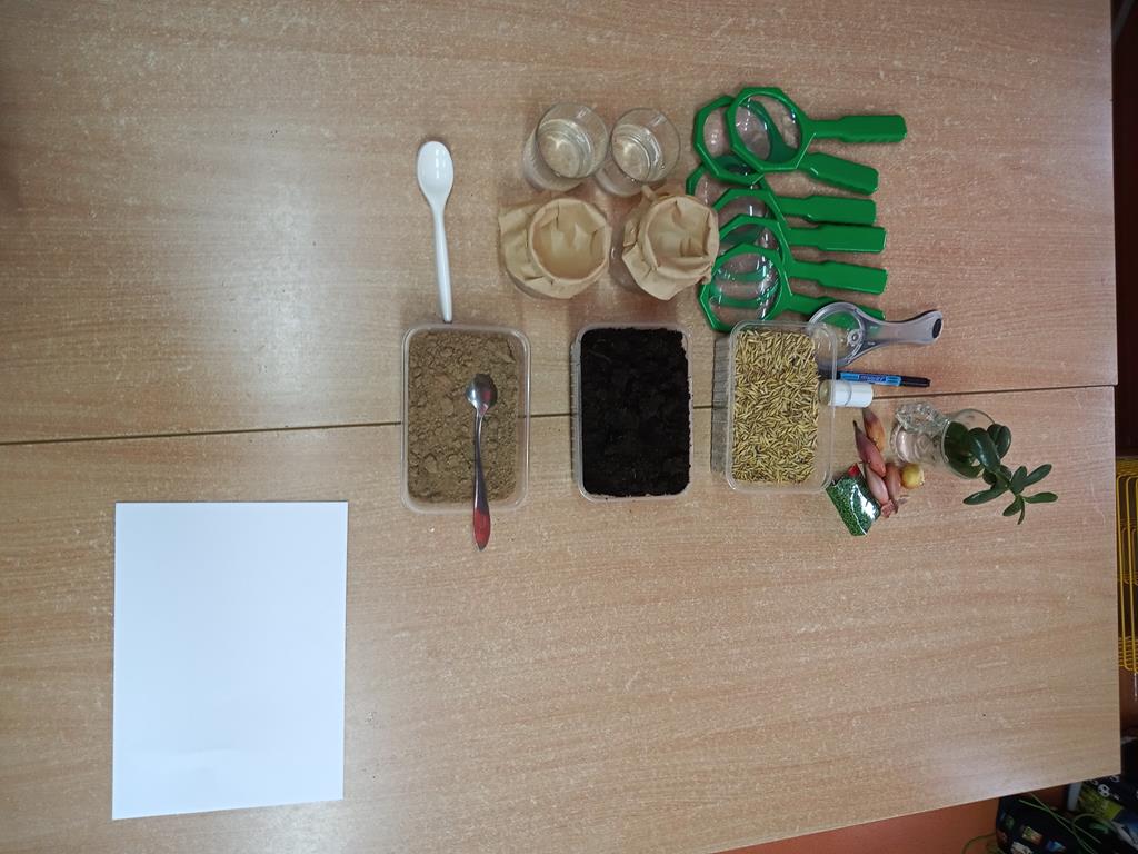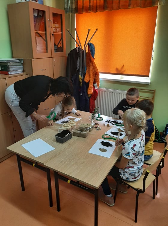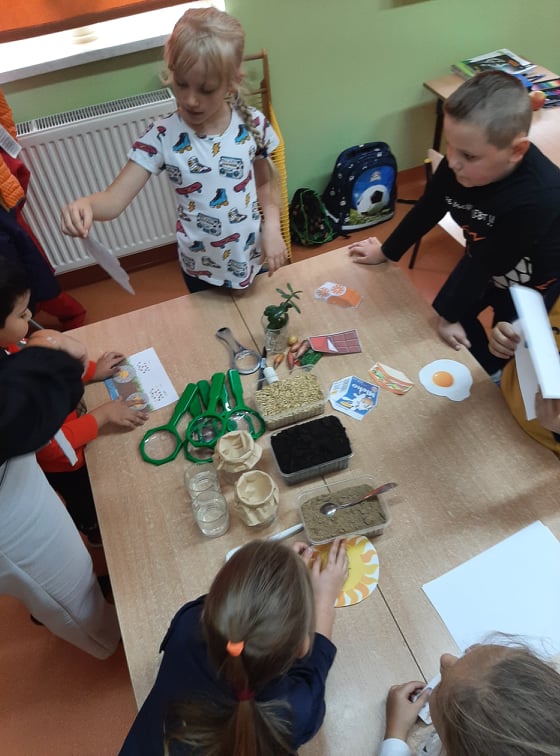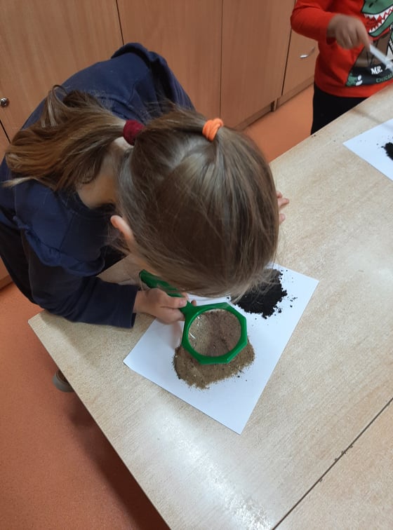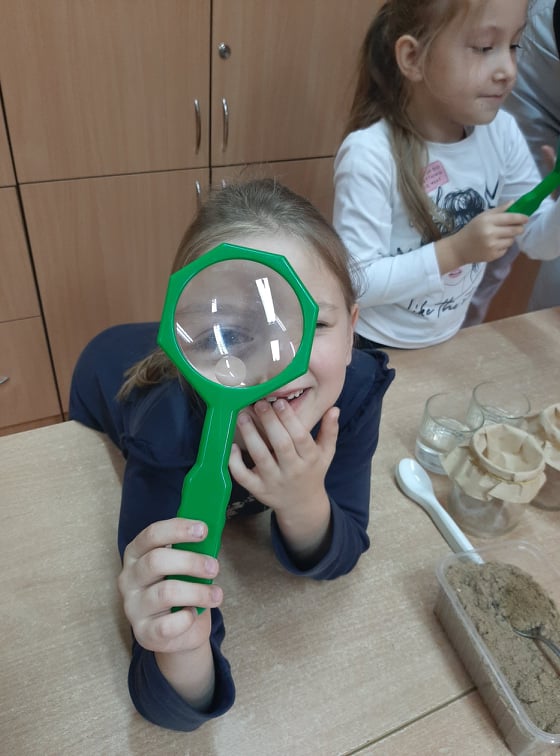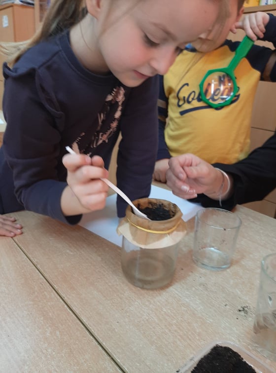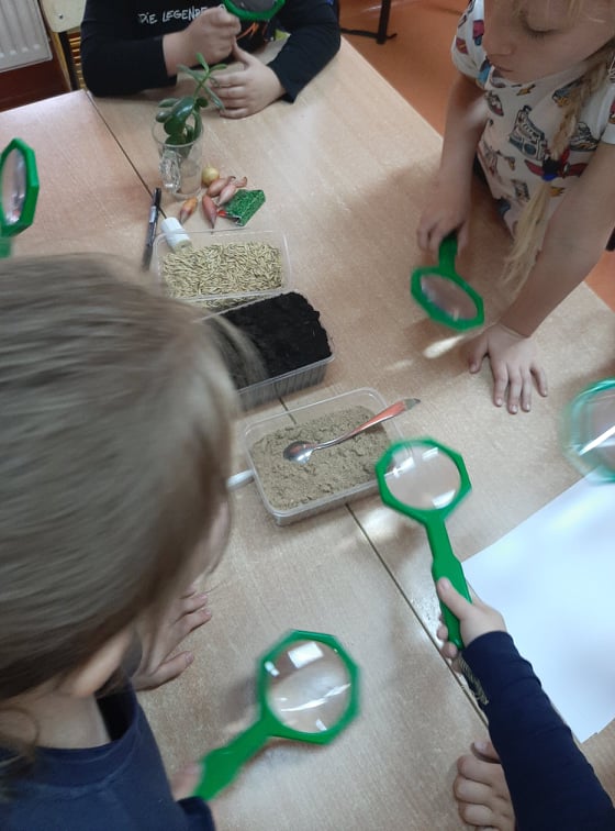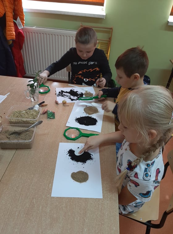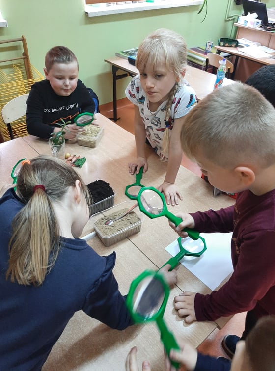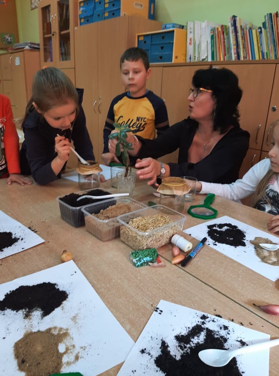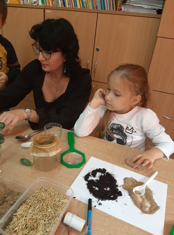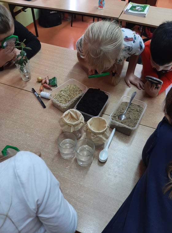 W końcu przeszliśmy do małego klasowego laboratorium, gdzie poznawaliśmy właściwości gleby. Mając do dyspozycji ziemię, piasek, lupy łyżki, wodę i filtry uczniowie mogli samodzielnie badać obecności organizmów żywych i szczątków roślinnych w ziemi i piasku, określić kolor gleby i piasku oraz sprawdzić, z której próbki woda szybciej przecieknie, jaki ma wtedy kolor, w którym słoiku zebrało się jej więcej. Dzieci z pomocą nauczyciela sformułowały wnioski ze swoich obserwacji i zabrały się za przygotowanie uprawy doświadczalnej. W przyniesionych do szkoły słoikach z ziemią i piaskiem zasiały w nich nasiona owsa i podlały. Z pomocą nauczyciela oznakowały swoje hodowle i postawiły słoiki w dobrze oświetlonym miejscu, aby poczekać na efekty, w którym podłożu lepiej urosną roślinki.