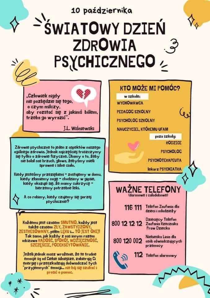 10 października to Światowy Dzień Zdrowia Psychicznego. Został ustanowiony w 1992 roku przez Światową Federację Zdrowia Psychicznego. Jego celem jest przede wszystkim zwrócenie uwagi na dbałość o zdrowie psychiczne, pomoc osobom chorym oraz ulepszanie opieki medycznej nad chorymi psychicznie.