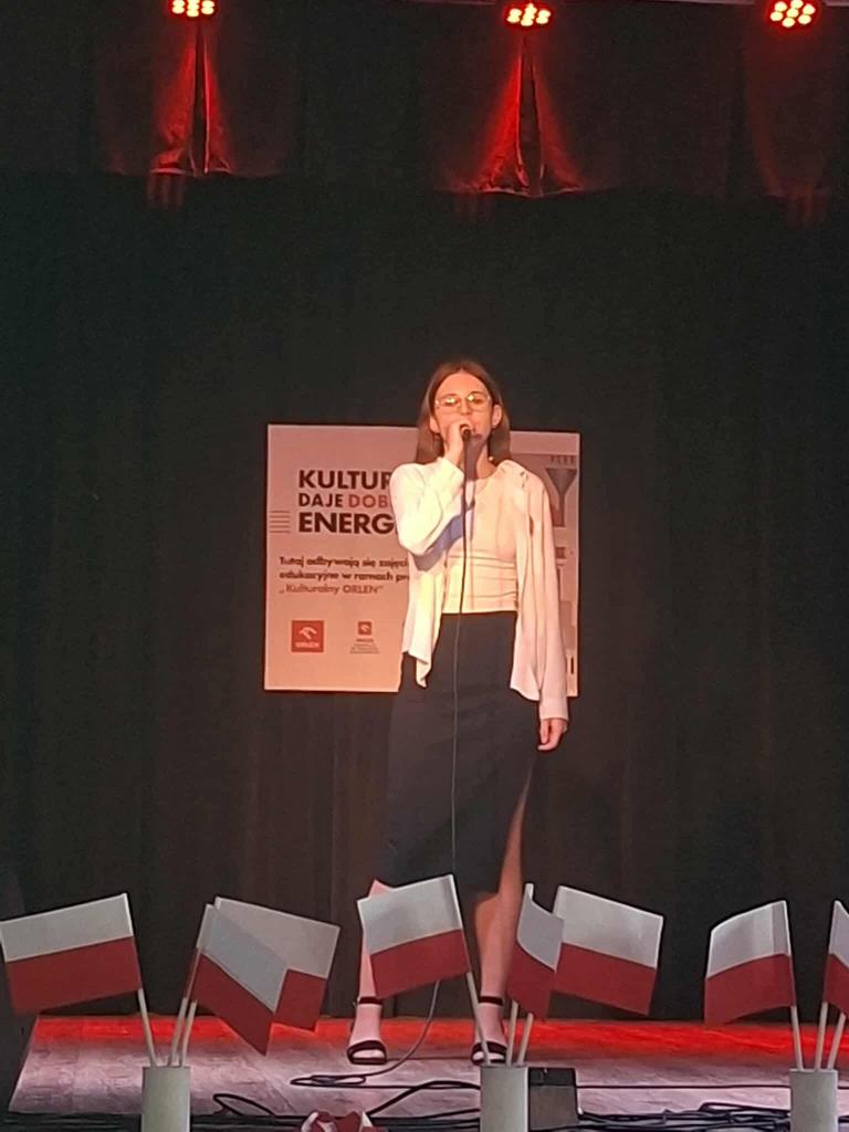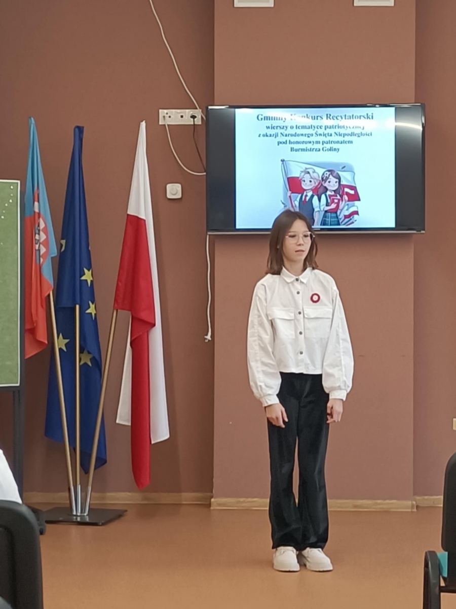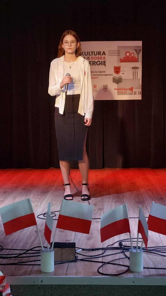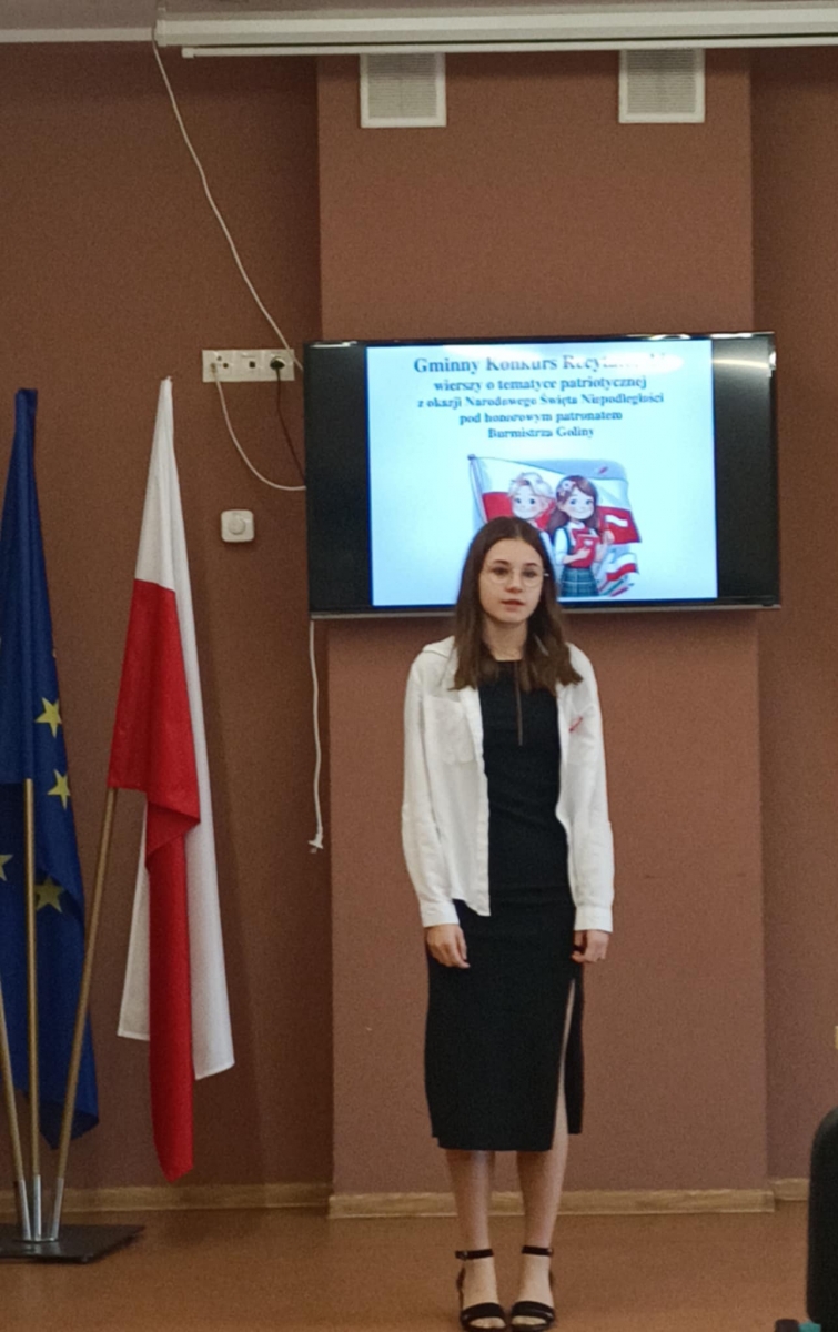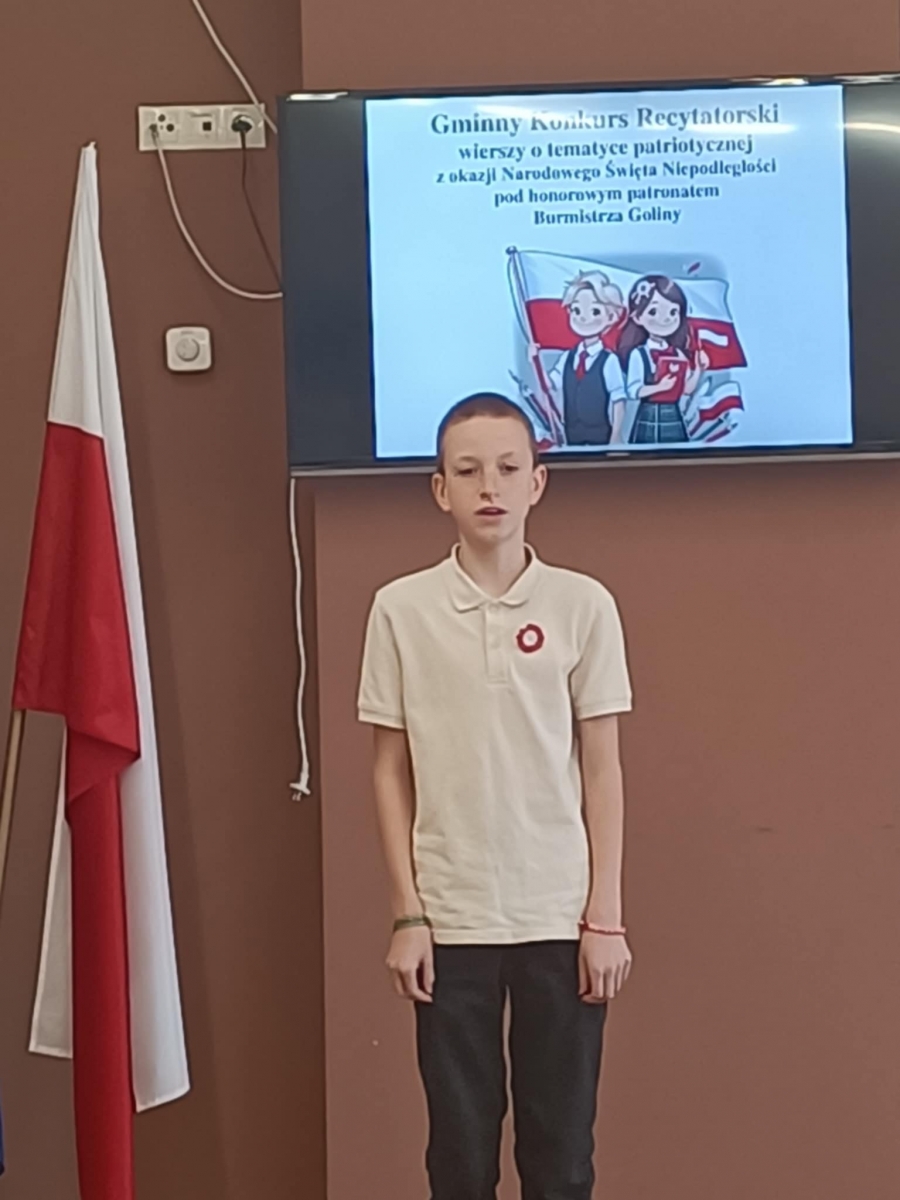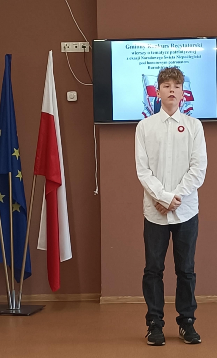 Wzięło w nim udział również czworo uczniów naszej szkoły: z klasy VI Blanka Wilant i Nikodem Urbański recytowali wiersz Marii Konopnickiej ,,Tam, w moim kraju”; z klasy VII – Michał Dryjer zaprezentował ,,Rotę”, a Vanessa Laskowska z klasy VIII wyrecytowała wiersz Tadeusza Kubiaka” ,,Tu wszędzie Polska”.