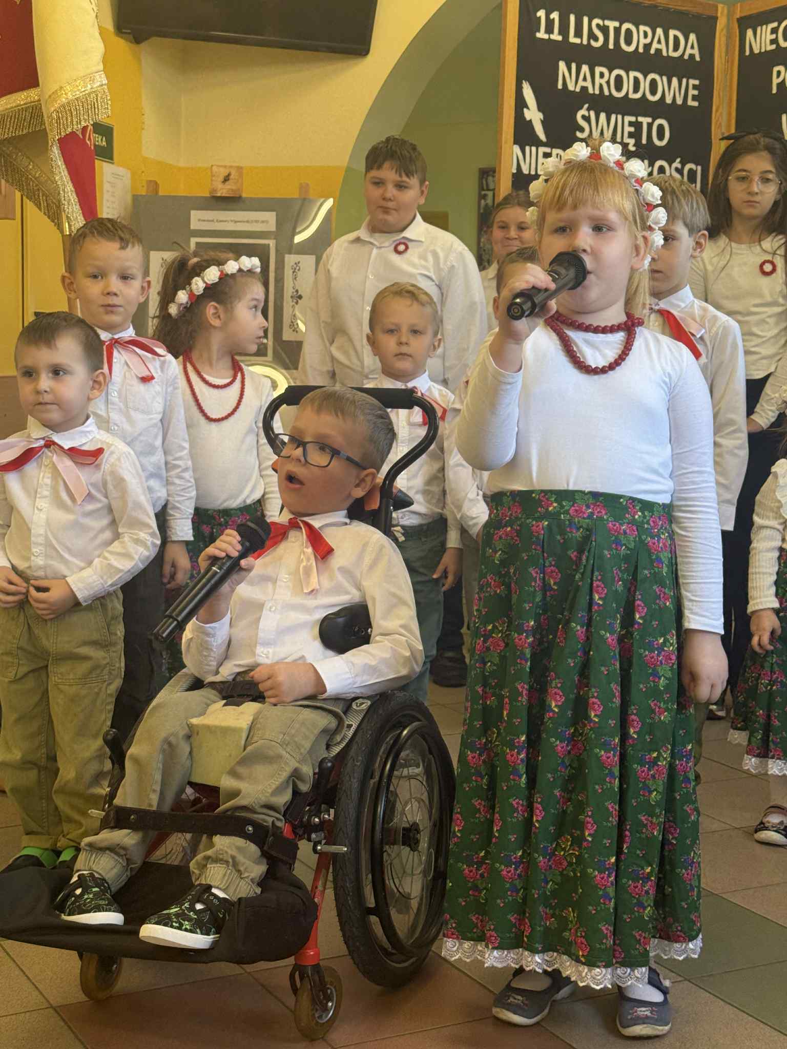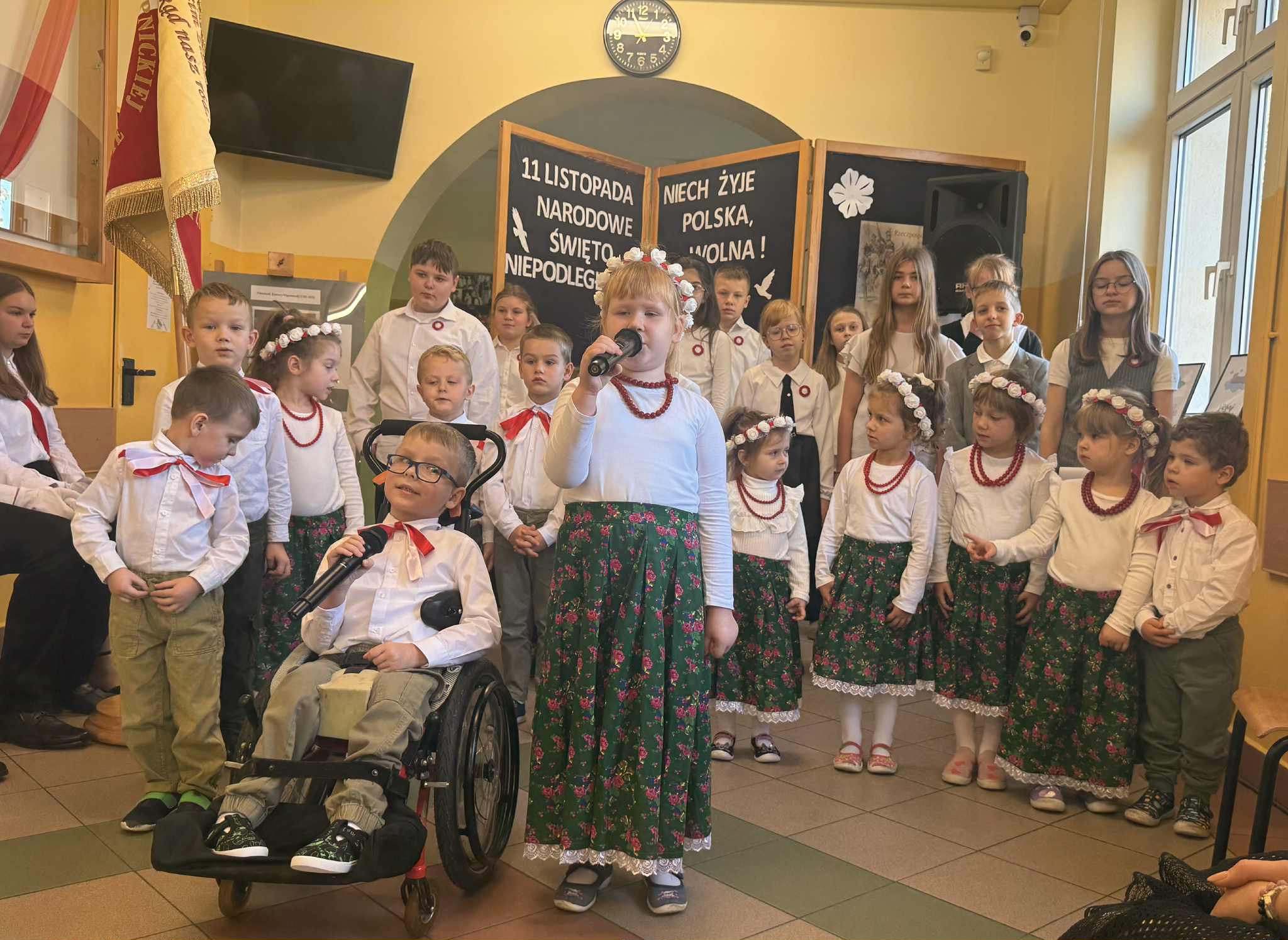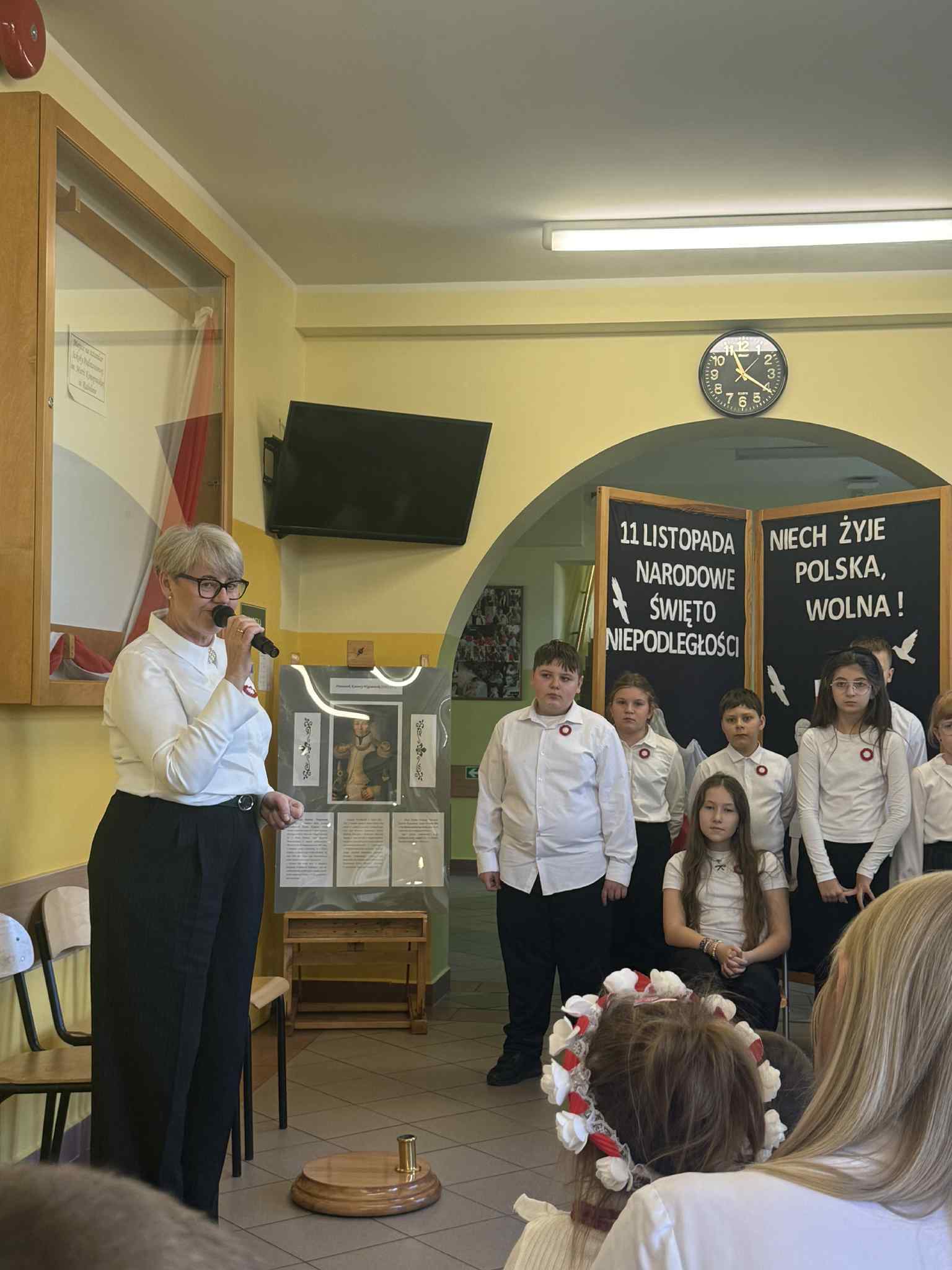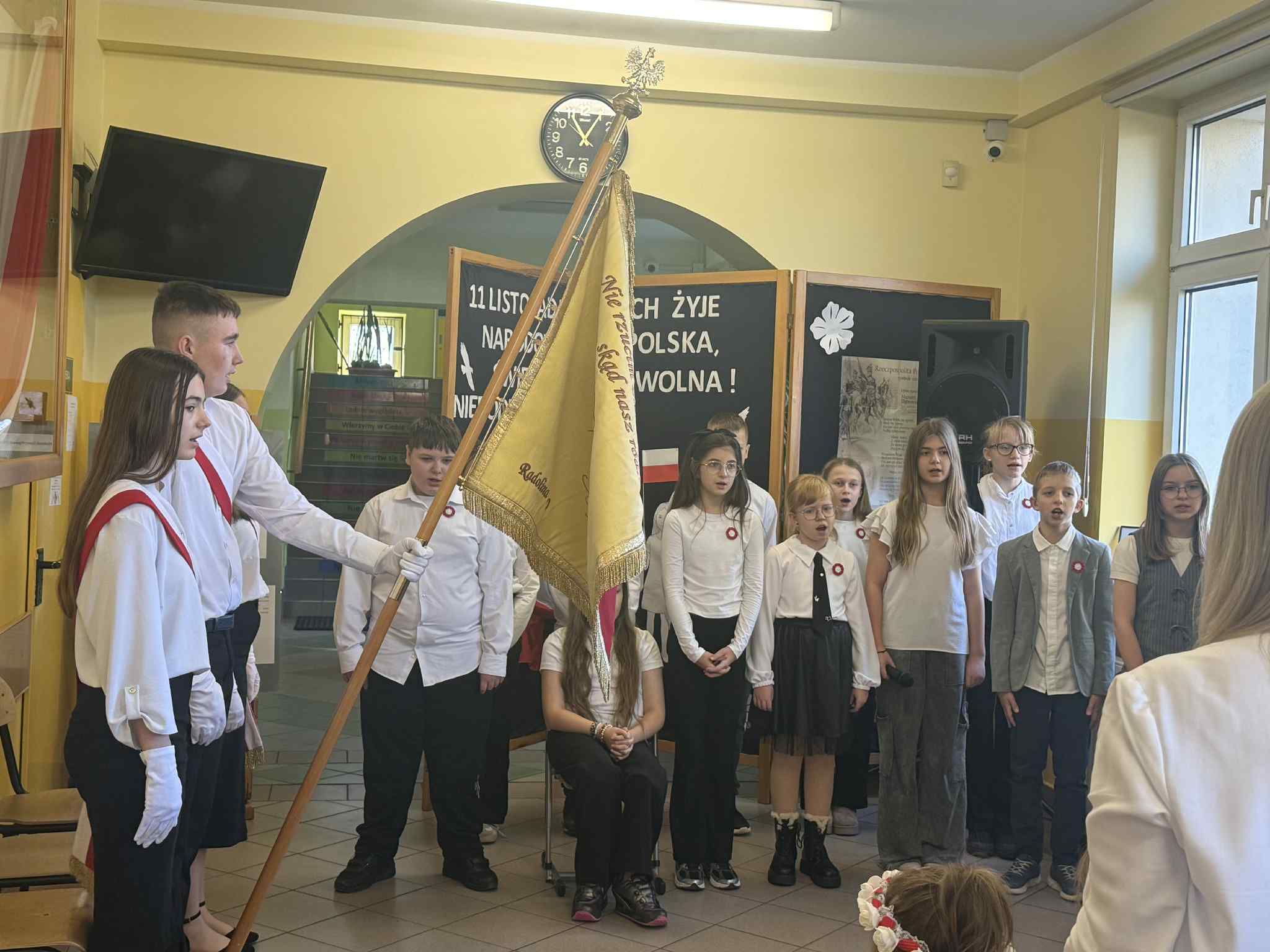 W dniu 7 listopada w naszej szkole odbył się uroczysty apel z okazji Narodowego Święta Niepodległości pod hasłem: "Niech żyje Polska". W wydarzeniu wzięli udział uczniowie klasy czwartej i piątej, którzy przypomnieli najważniejsze wydarzenia z historii naszego kraju. Starsi uczniowie zaprezentowali wzruszające wiersze patriotyczne. Dzieci z oddziałów przedszkolnych z radością zaśpiewały znaną pieśń "Przybyli ułani pod okienko". Na zakończenie apelu Vanessa Laskowska wykonała piękną piosenkę ,,Jest takie miejsce, jest taki kraj", która wprowadziła wszystkich w nastrój zadumy i dumy z bycia Polakiem. Cała społeczność szkolna w ramach akcji "Niepodległa do Hymnu!" odśpiewała Hymn Polski.