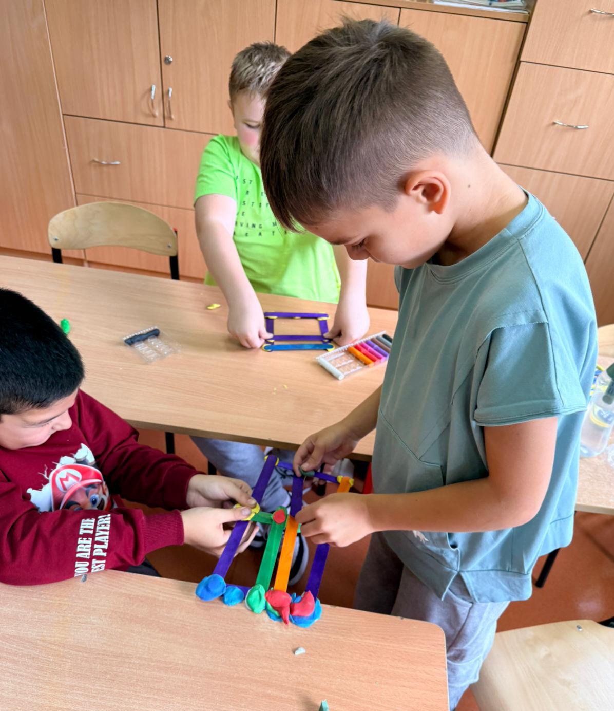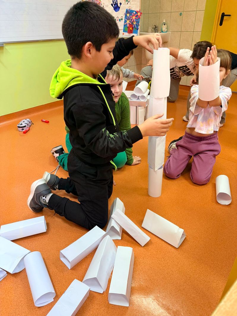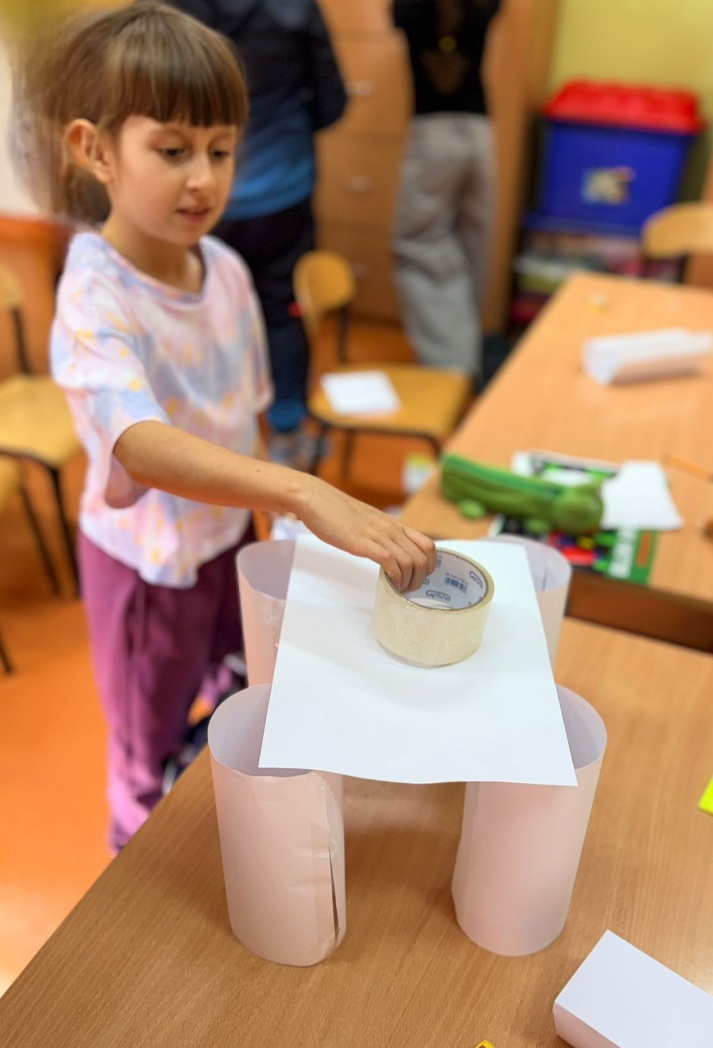 Cały cykl doświadczeń pozwolił dzieciom zrozumieć, że stabilność konstrukcji zależy od kształtu, proporcji i sposobu połączenia elementów, że trójkątne formy są najtrwalsze, a planowanie, precyzja i współpraca to klucz do sukcesu inżynierskiego projektu.