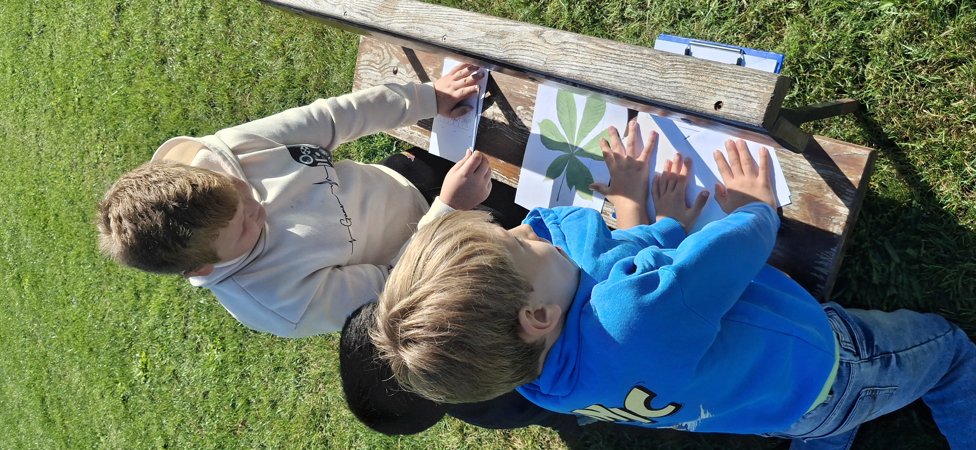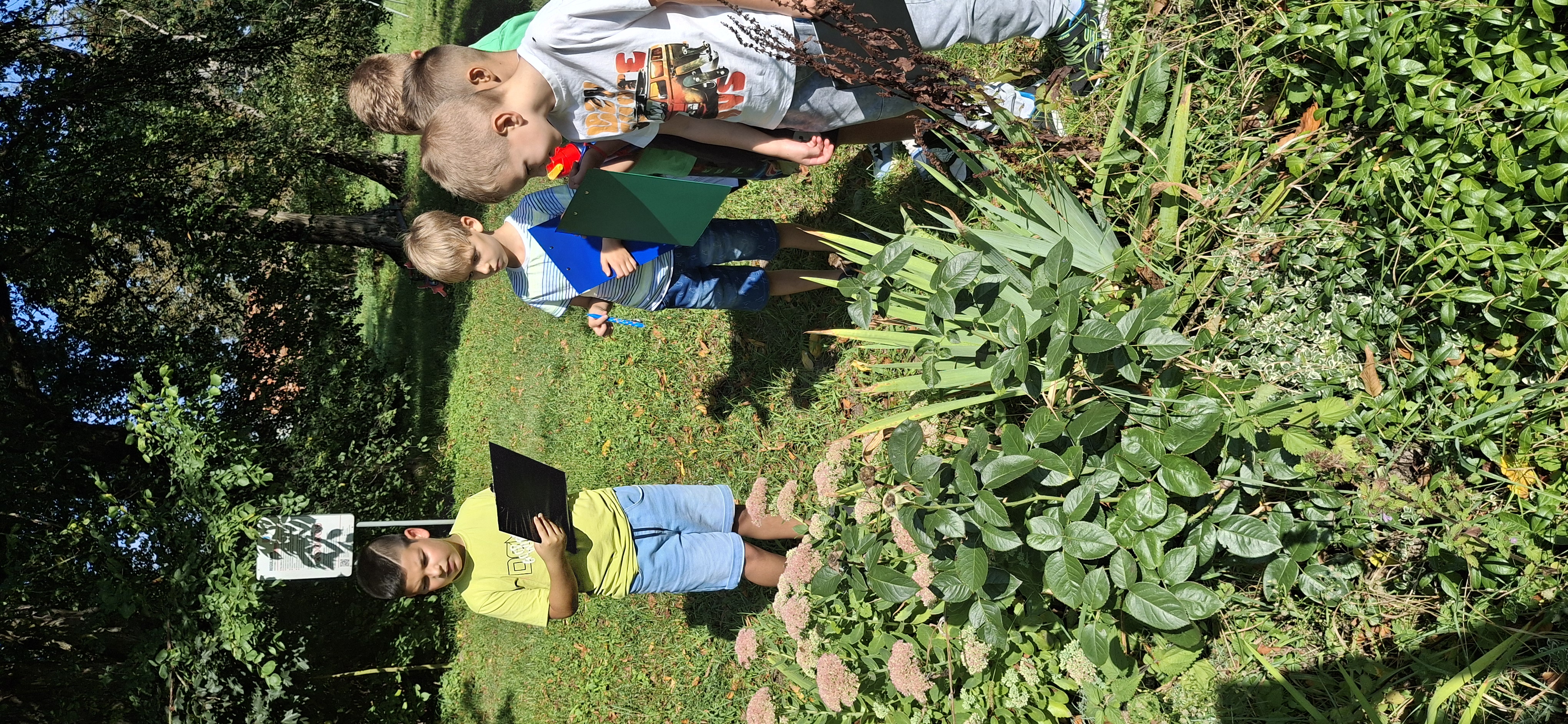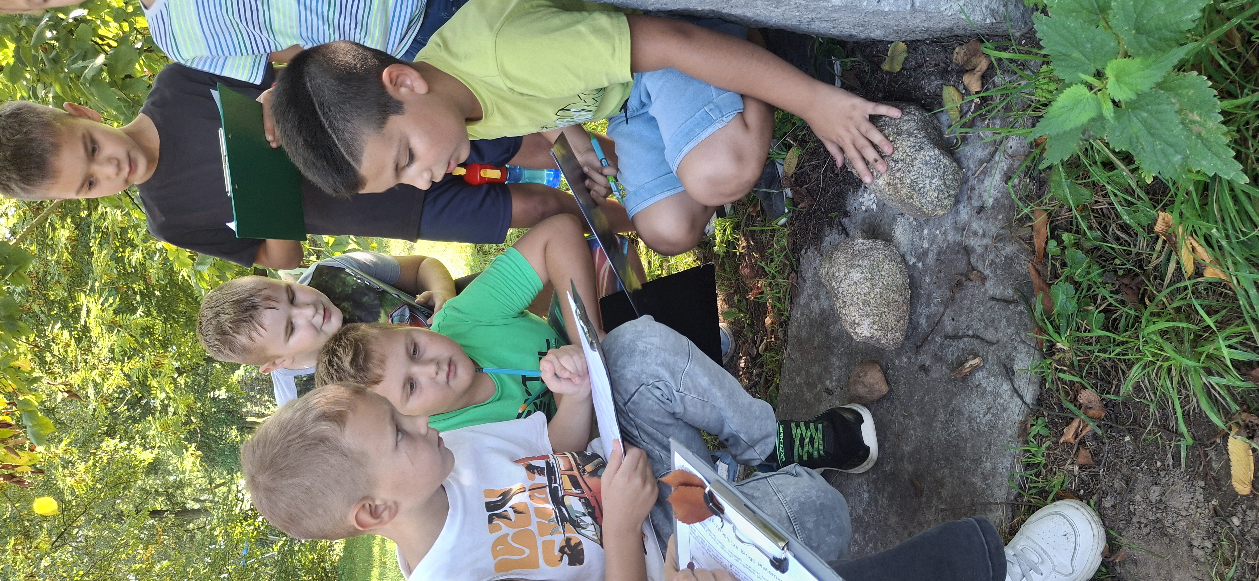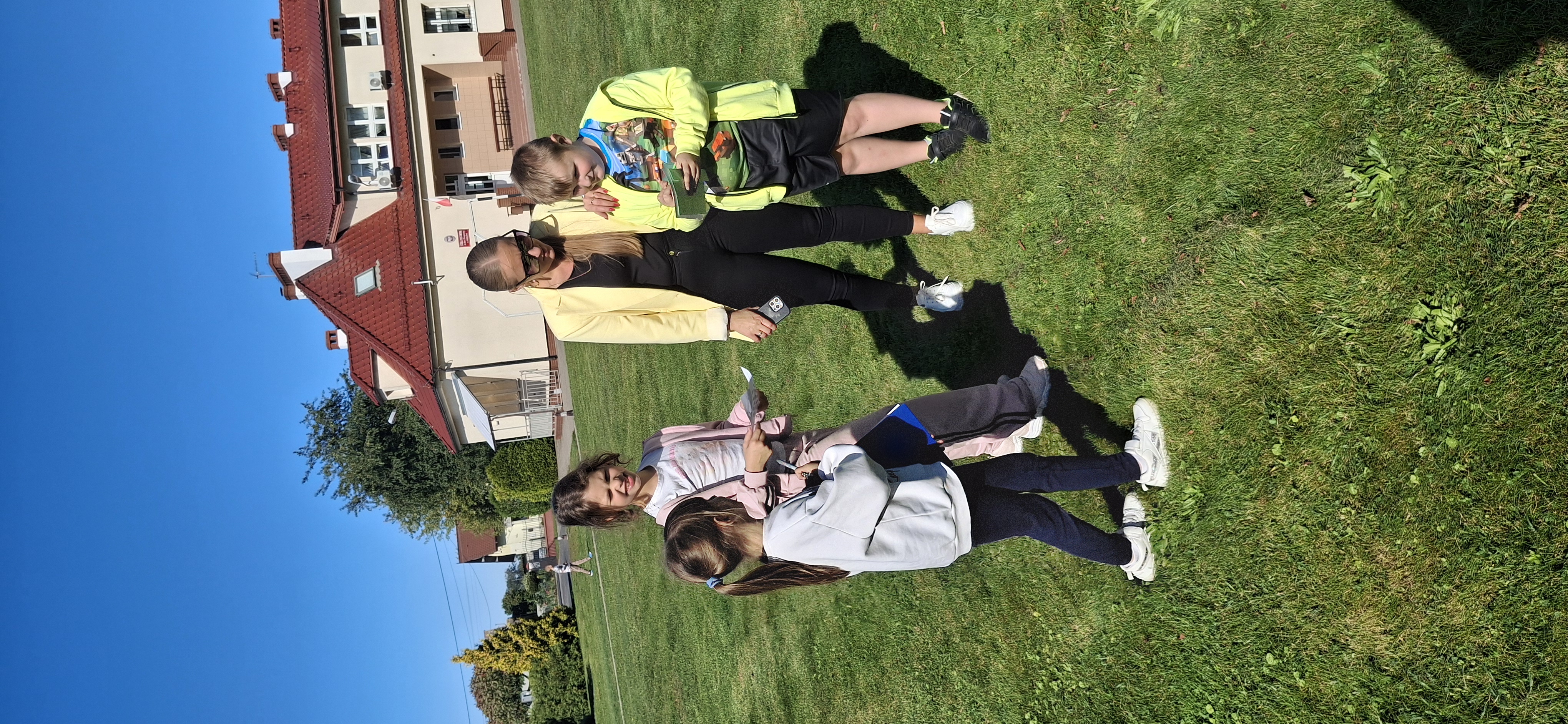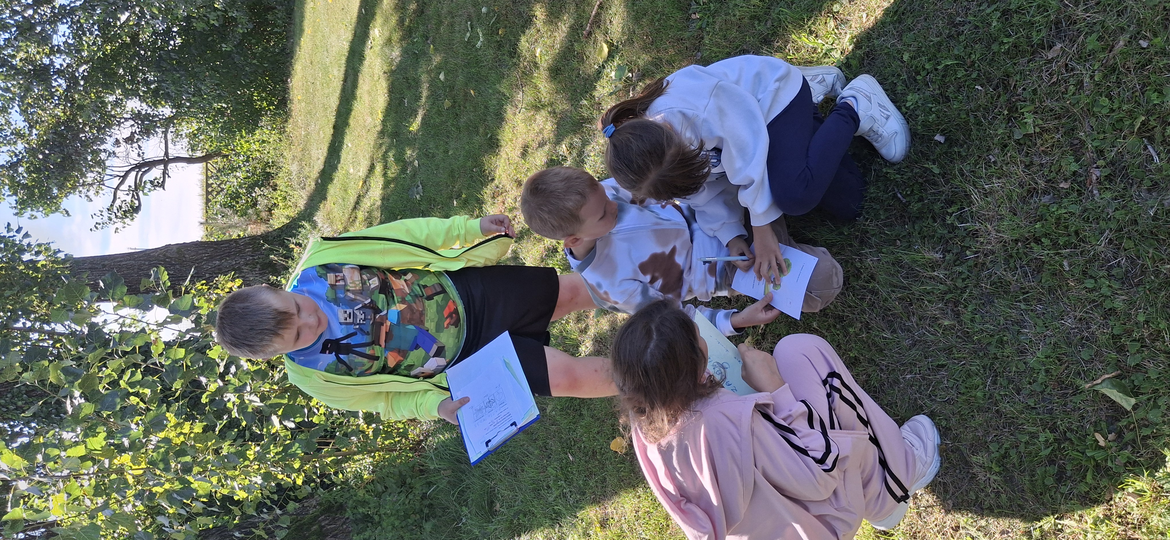Najpierw wzięliśmy udział w Przyrodniczym Bingo. Spacerując po okolicy, uczniowie wykonywali matematyczne zadania inspirowane naturą – liczyli płatki kwiatów, kroki między drzewami czy kolory, które udało się dostrzec w przyrodzie. Dzieci z entuzjazmem odkrywały, że matematyka towarzyszy nam dosłownie wszędzie.