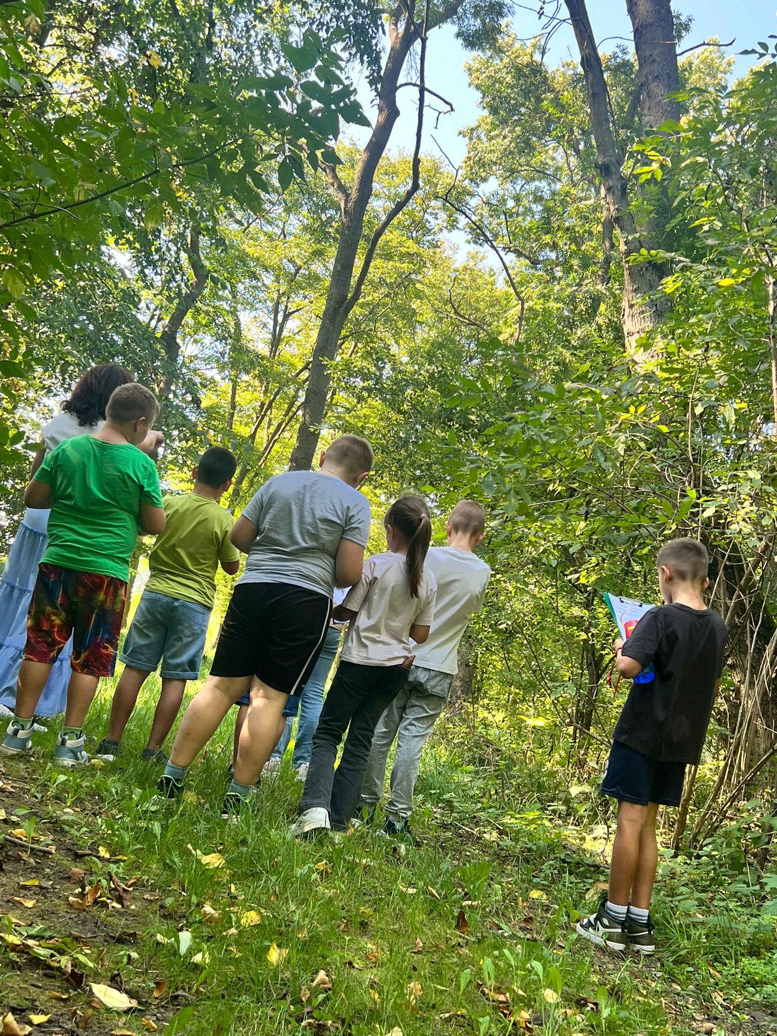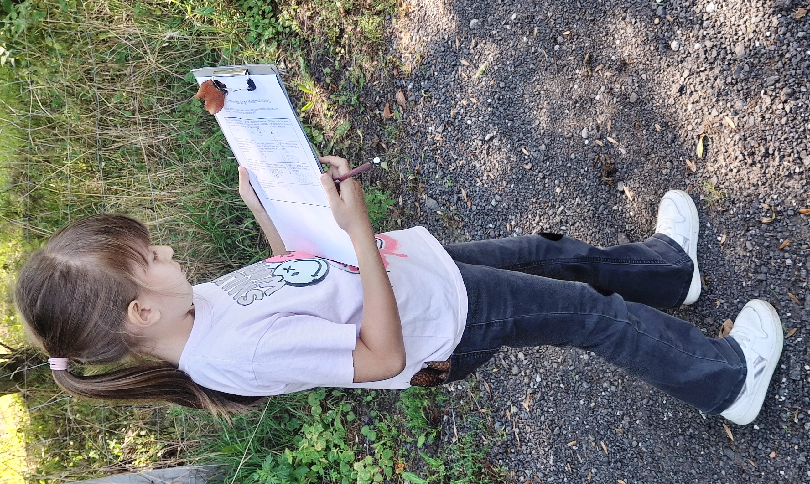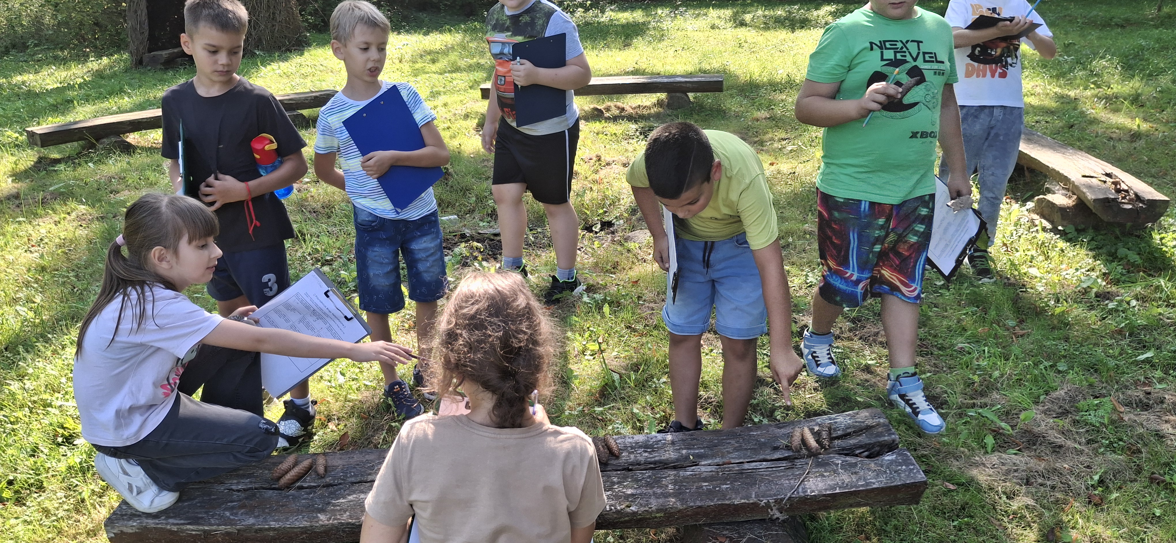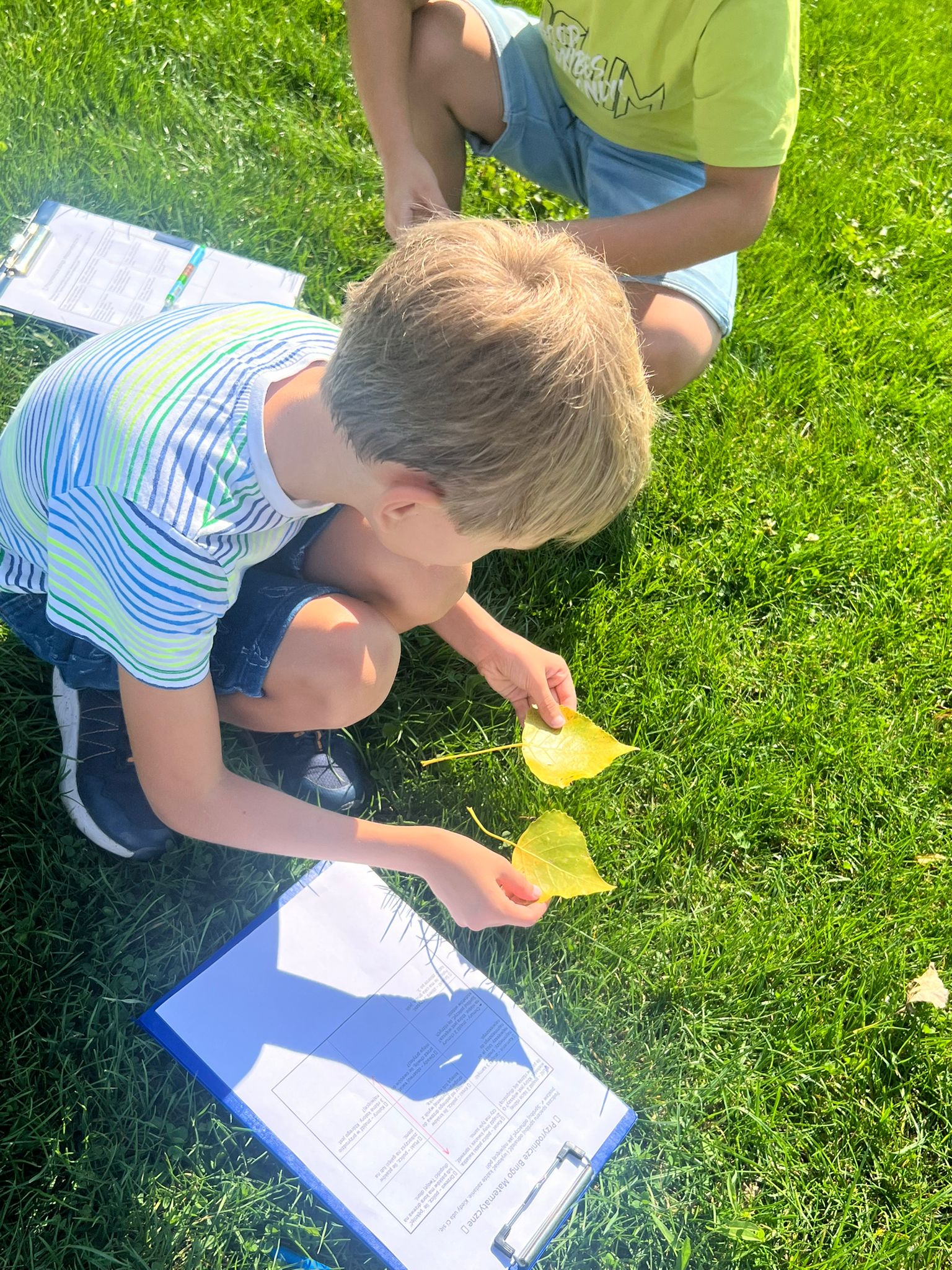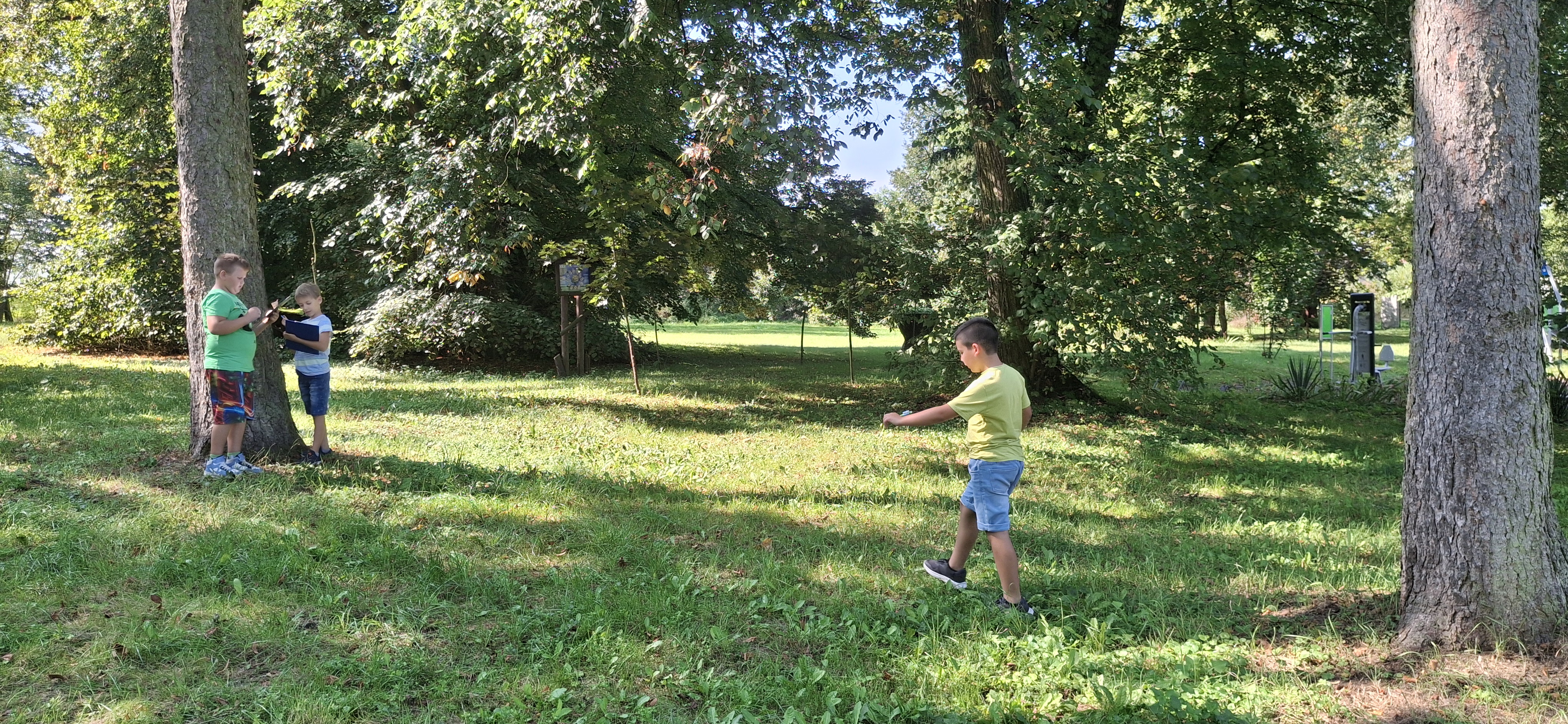 Najpierw wzięliśmy udział w Przyrodniczym Bingo. Spacerując po okolicy, uczniowie wykonywali matematyczne zadania inspirowane naturą – liczyli płatki kwiatów, kroki między drzewami czy kolory, które udało się dostrzec w przyrodzie. Dzieci z entuzjazmem odkrywały, że matematyka towarzyszy nam dosłownie wszędzie.