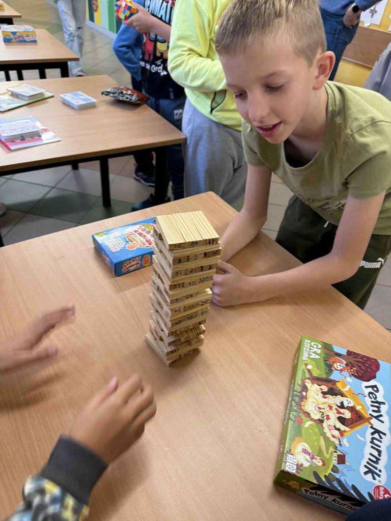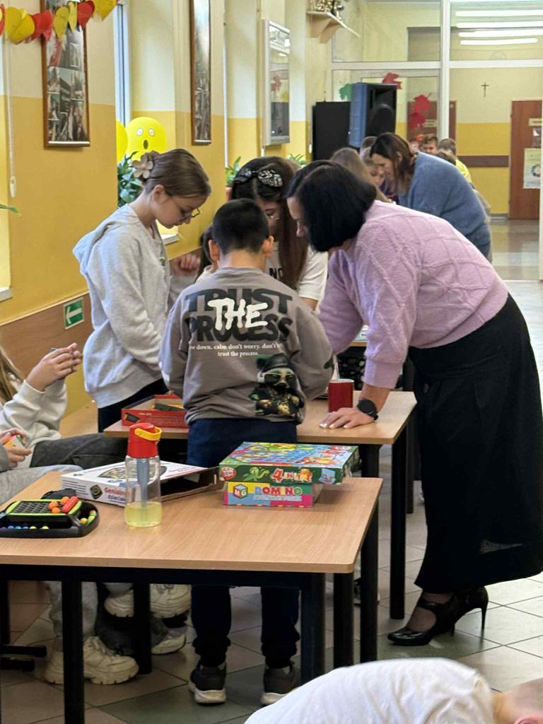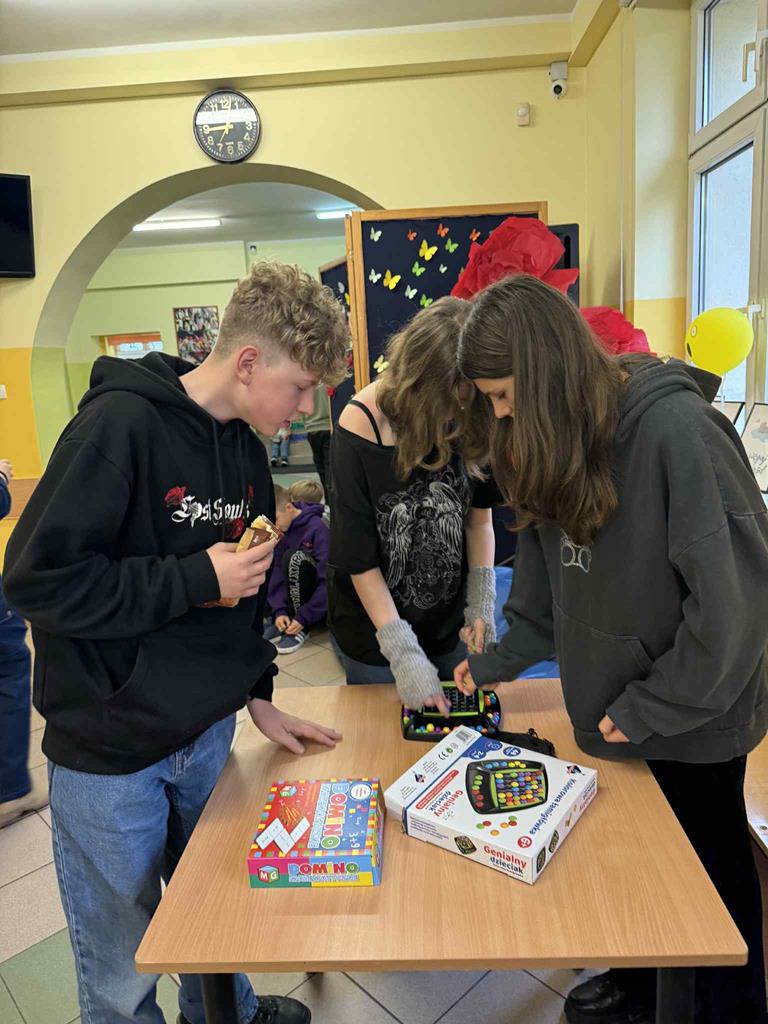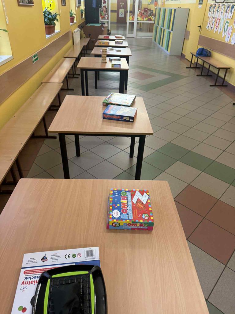 W naszej szkole odbył się Dzień Matematycznych Gier Planszowych, zorganizowany przez nauczyciela matematyki we współpracy z Samorządem Uczniowskim. Podczas przerw korytarz szkolny zamienił się w przestrzeń pełną planszowych emocji, strategii i dobrej zabawy. Przy specjalnie przygotowanych stolikach uczniowie mieli okazję zagrać w gry rozwijające logiczne myślenie, refleks oraz umiejętności matematyczne.