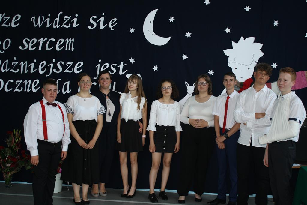 Ósmoklasiści wraz z wychowawczynią, panią Joanną Kryszak, przygotowali krótką część artystyczną. Na uroczystości zakończenia roku szkolnego i pożegnania absolwentów nie zabrakło ciepłych słów pod adresem uczniów, nauczycieli, rodziców, pracowników obsługi i administracji. . Podziękowano za cały rok wspólnej pracy oraz podejmowane inicjatywy. Szkołę podstawową z wyróżnieniem ukończyły dwie uczennice klasy ósmej.