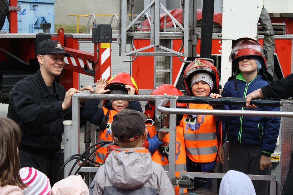 Celem wycieczki było poznanie pracy strażaków, kształtowanie świadomości znaczenia i charakteru ich pracy, zapoznanie się z wyposażeniem wozów oraz kształtowanie właściwych zasad zachowania w miejscach publicznych. Dzieci mogły również doskonalić, pogłębiać, zdobywać nową wiedzę o otaczającym nas świecie. W trakcie spotkania strażacy zaznajomili dzieci z ciekawostkami związanymi z ich pracą zawodową, przestrzeganiem zakazów, zachowaniem bezpieczeństwa w czasie: pożaru, burzy oraz wypadku. Dzieci dowiedziały się w jakich okolicznościach można wzywać straż pożarną, że strażacy nie tylko gaszą pożary, ale również są wzywani do różnych wypadków samochodowych i nie tylko, oraz obejrzały pokaz zjazdu po rurze do akcji ratunkowej. Jak zawsze największe zainteresowanie wzbudziły wozy strażackie. Były takie, które na co dzień wyjeżdżają do różnych akcji oraz specjalistyczny wóz z wysięgnikiem i koszem. Dzieci mogły je z bliska oglądać oraz podziwiać wyposażenie, jakim strażacy dysponują podczas swojej ciężkiej i odpowiedzialnej pracy. Przez chwilę wszyscy uczestnicy wycieczki mogli poczuć się jak strażacy podnosząc ciężki sprzęt do rozcinania karoserii samochodu. Nie obyło się bez lania wodą z węża strażackiego.