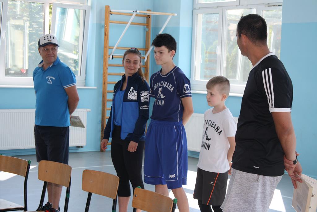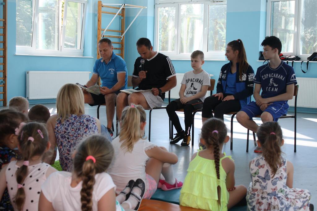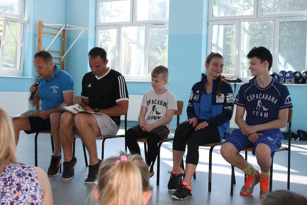 W związku z Ogólnopolskim Tygodniem czytania dzieciom pod hasłem ,, Sportowcy czytają dzieciom ’’ gościliśmy Pana Dariusz Kasprzaka wraz z przedstawicielami Klubu bokserskiego Copacabana w Koninie. W spotkaniu uczestniczyli również młodzi sportowcy: Marta, Krzysztof i Denis. Pan Dariusz to były mistrz Polski w wadze piórkowej, który stoczył 220 walk , a obecnie jest trenerem . W spotkaniu brała udział Pani Karolina Kasprzak z Biblioteki Publicznej w Golinie. Wszystkich gości oraz zebraną społeczność szkolną powitała Pani Dyrektor Alina Kozłowska. Spotkanie rozpoczęło się głośnym czytaniem utworu Juliana Tuwima ,, Lokomotywa ’’ przez Pana Dariusza oraz Pana Michała nauczyciela wychowania fizycznego w naszej szkole. Panowie poradzili sobie znakomicie i zostali nagrodzeni gromkimi brawami. Następnie uczniowie oraz dzieci z oddziałów przedszkolnych mogły posłuchać ciekawostek związanych z boksem, poznać technik wykorzystywanych na treningach. Dzięki temu zebrani mogli uświadomić sobie jak ważne jest w życiu uprawianie sportu. Najbardziej widowiskowym okazał się pokaz treningu poszczególnych zawodników. Sportowcy wykazali się dużą sprawnością fizyczną i umiejętnościami . Zapewne spotkanie pozostanie długo w naszej pamięci.
