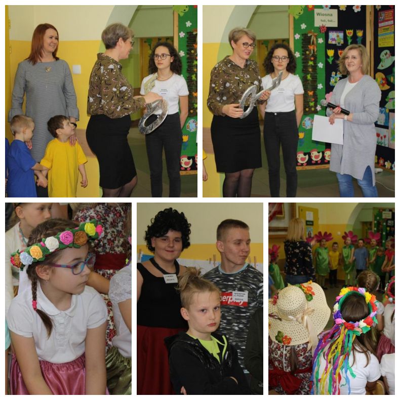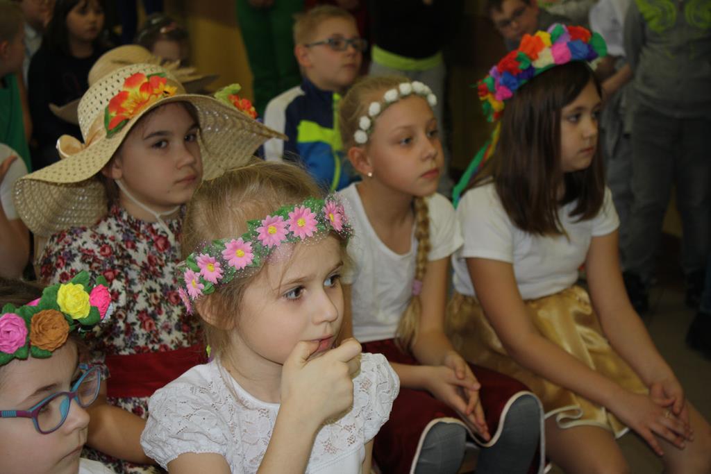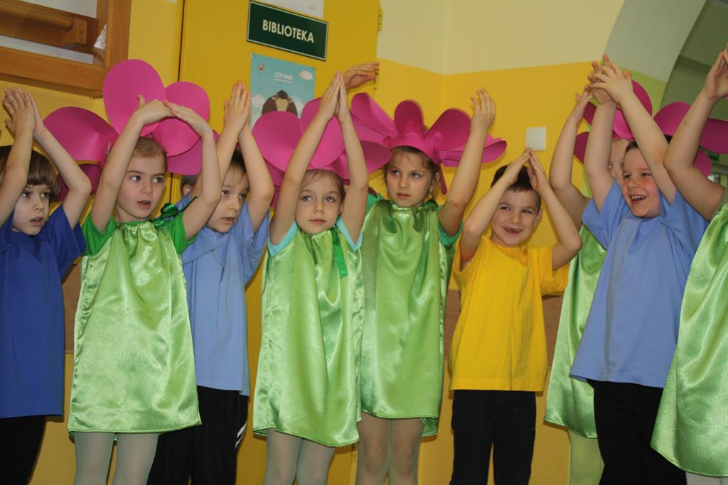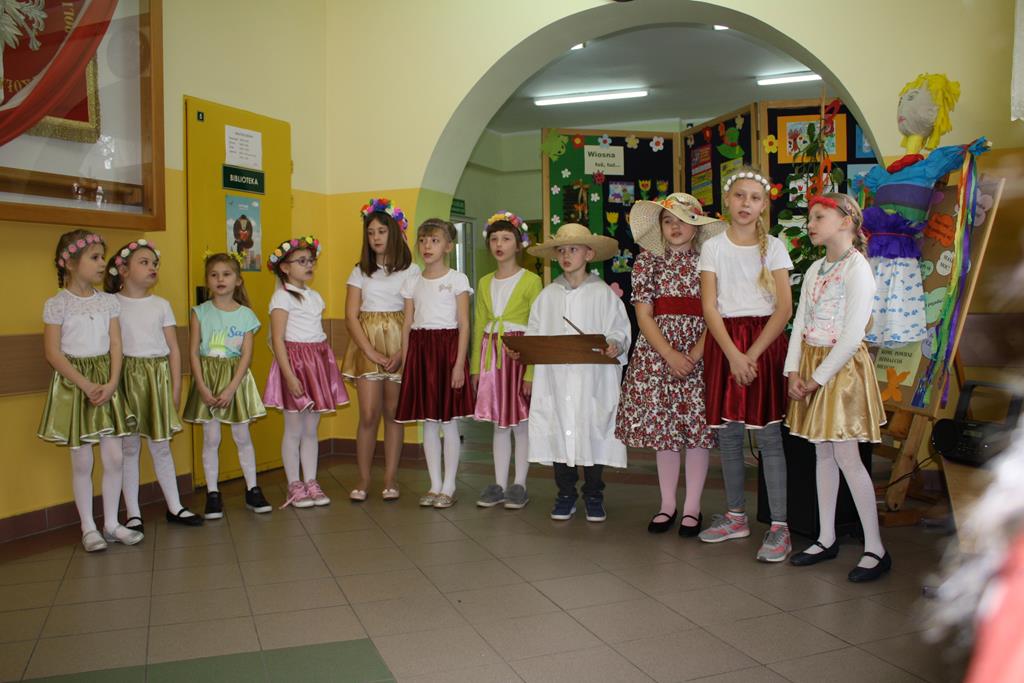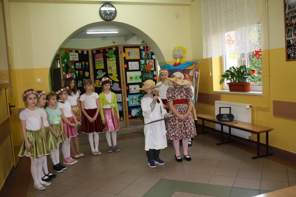 W całej szkole zapachniało wiosną. Nastrajały do tego wiosenne dekoracje w salach, na oknach i drzwiach każdej klasy oraz występy Grupy Aktorskiej klas I i II w montażu słowno-muzycznym „Witaj Wiosno” pod kierunkiem p. Magdaleny Lewartowskiej, a także przedszkolaków w piosence i „Tańcu kwiatów” pod kierunkiem p. Emilii Napierały i Agnieszki Kołodziejczak. Dzieci radosnymi okrzykami przywoływały wiosnę, a żegnały zimę.