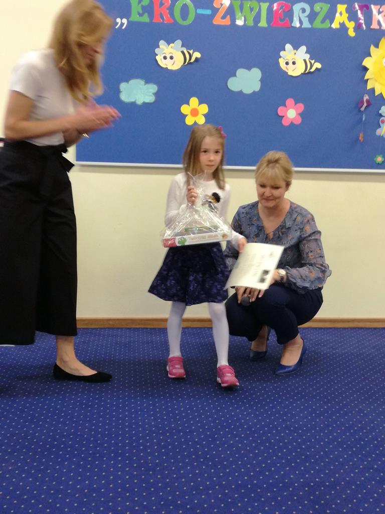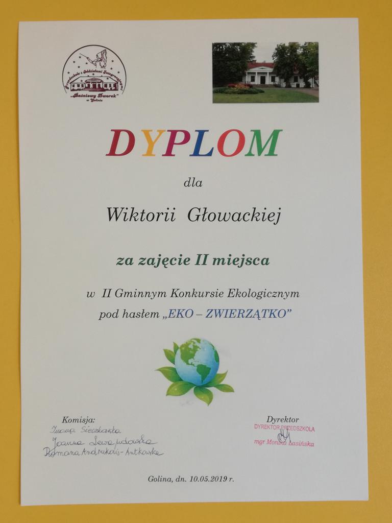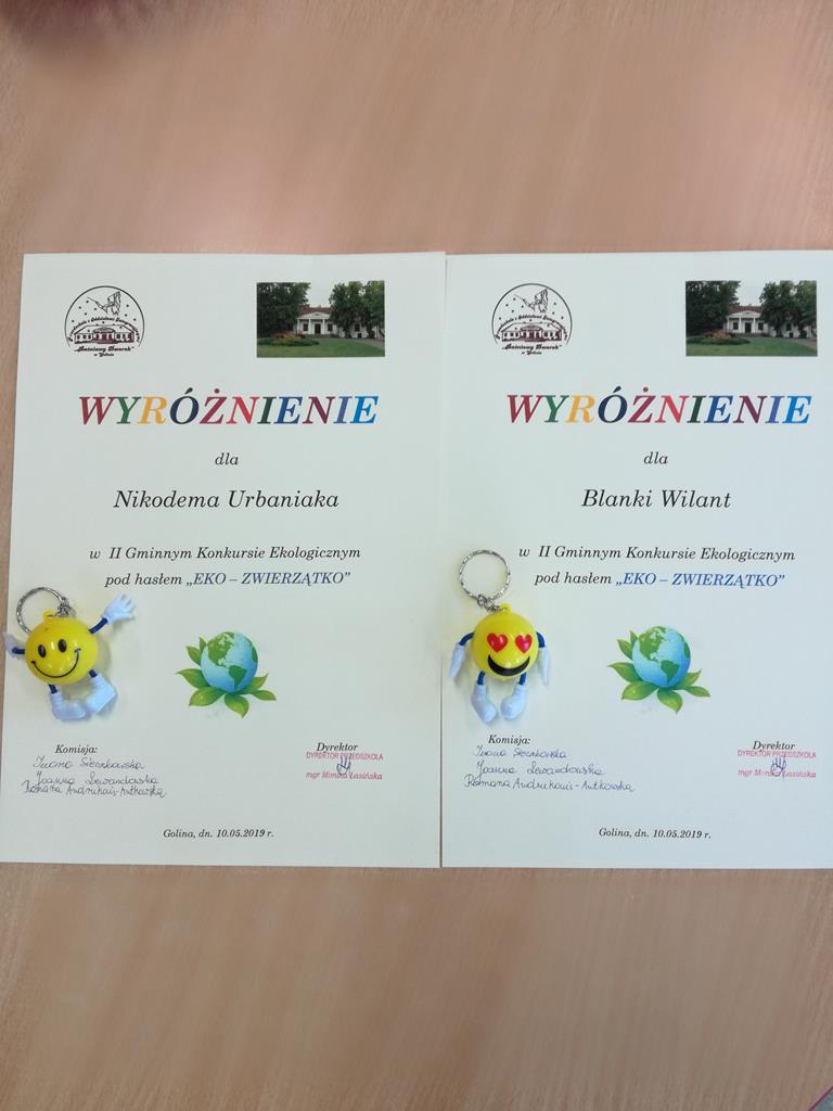 Na przełomie miesiąca marca i kwietnia dzieci z naszego Oddziału Przedszkolnego wzięły udział w konkursie na „Eko- zabawkę” organizowanym przez Przedszkole „Baśniowy Dworek” w Golinie. W konkursie udział wzięło bardzo dużo ciekawych i pomysłowych prac. Jak co roku dzieci z naszego przedszkola chętnie zaangażowały się i wykonały piękne prace konkursowe. Tym bardziej jesteśmy dumni z naszych wychowanków, którzy osiągnęli sukces i zdobyli - II miejsce: Wiktoria G. oraz dwa wyróżnienia Nikodem U. oraz Blanka W.