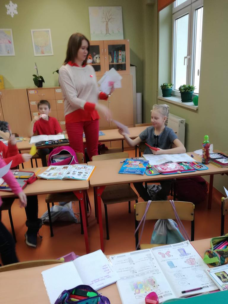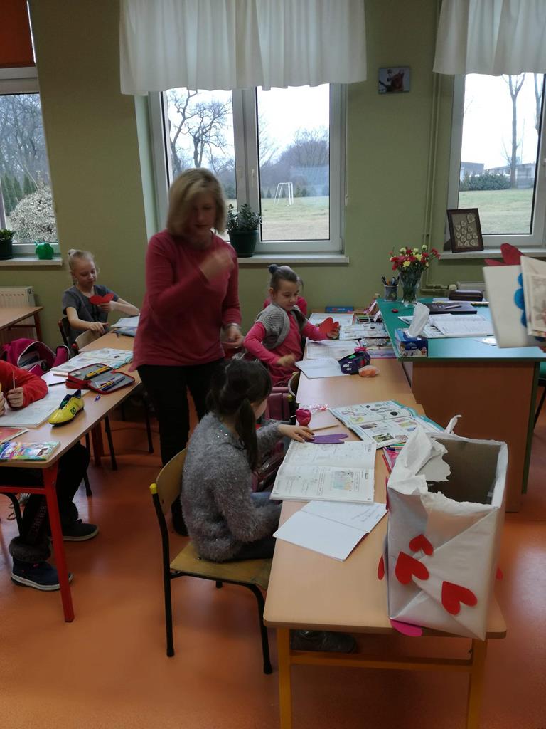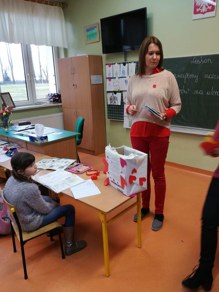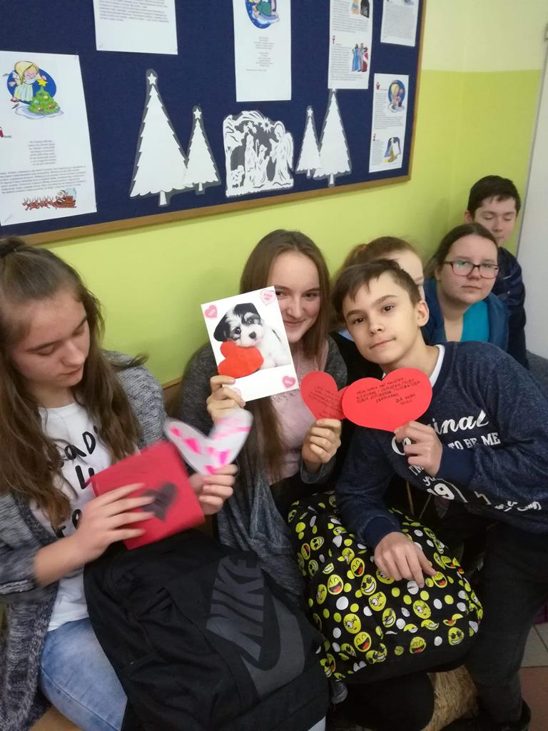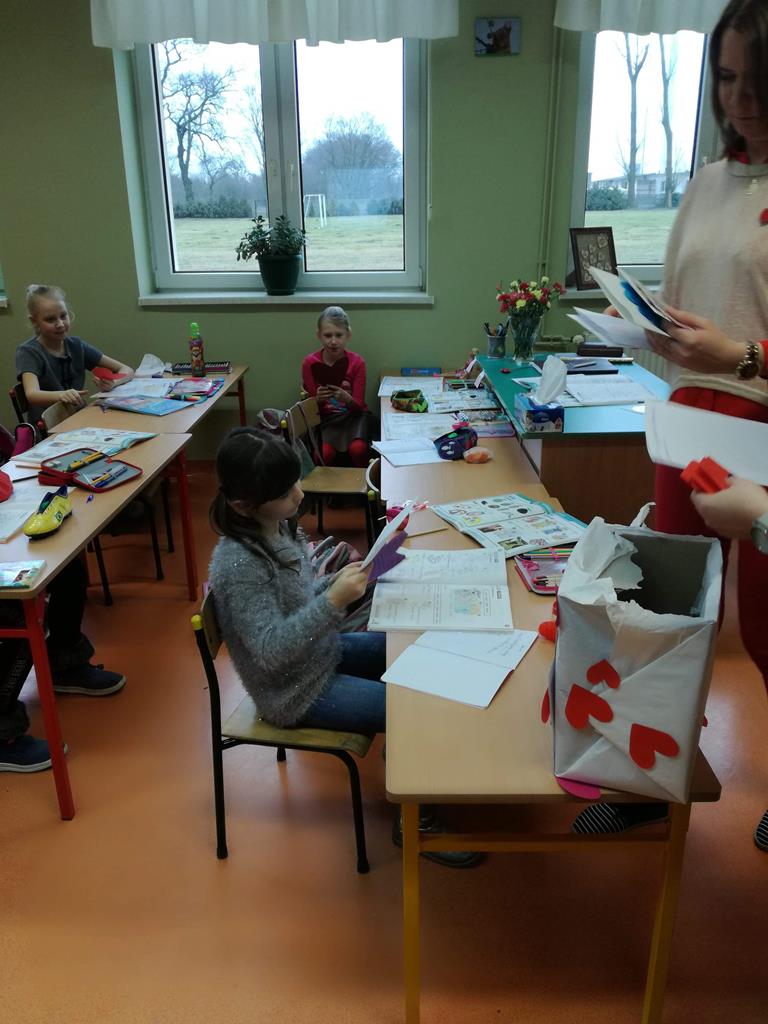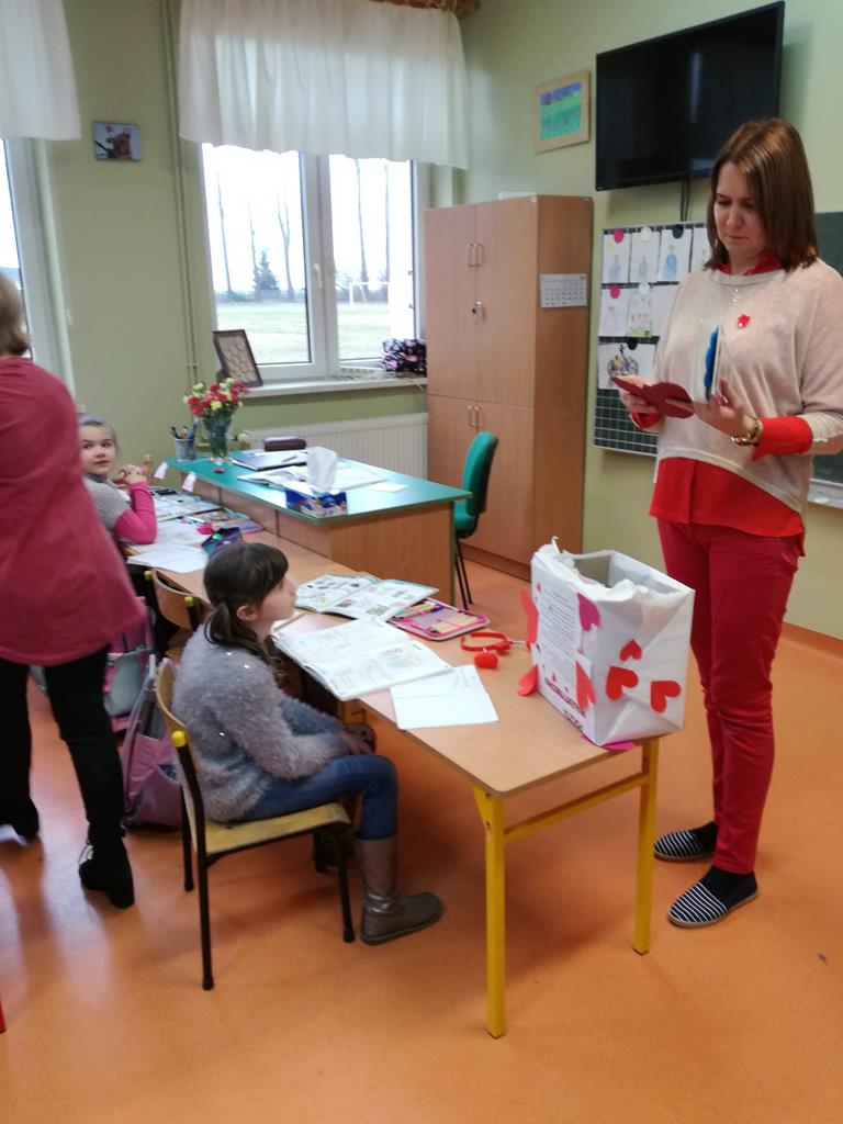 Na korytarzach szkolnych w tym dniu gościł kolor czerwony lub elementy stroju w tym kolorze np. opaska, papierowe serce. Bibliotekarz szkolny p. Magdalena Lewartowska przygotowała informacje dotyczące osoby Św. Walentego, jego kultu i relikwii. Niewątpliwie największą atrakcją była Poczta walentynkowa. To doskonała okazja , aby wyznać miłość swojej sympatii. Co ważne można to zrobić anonimowo. Miłosne wyznania były zbierane do specjalnego pojemnika , a następnie rozdawane w klasach przez p. Bernadettę Kucharską i panią Emilię Napierałę.