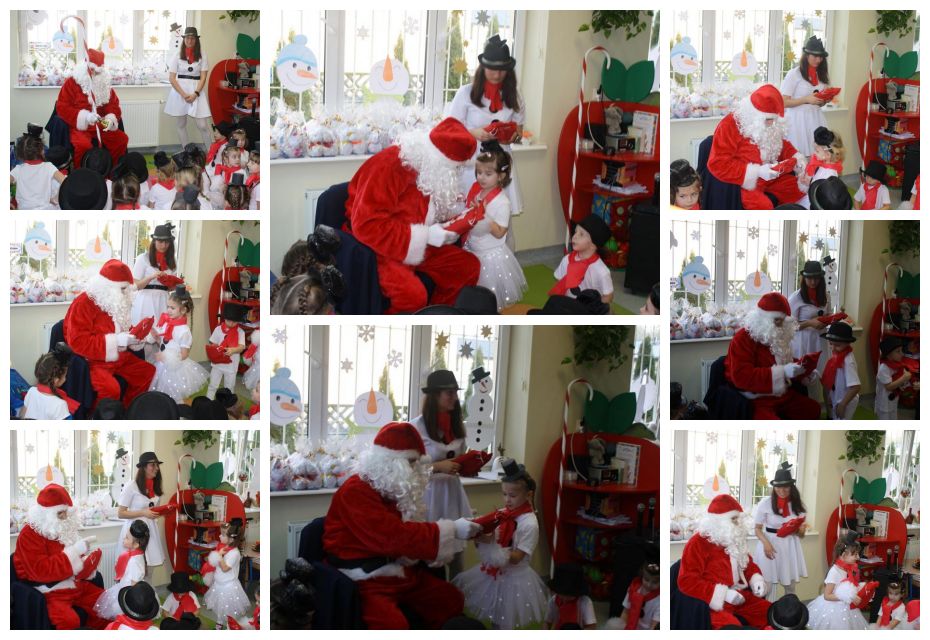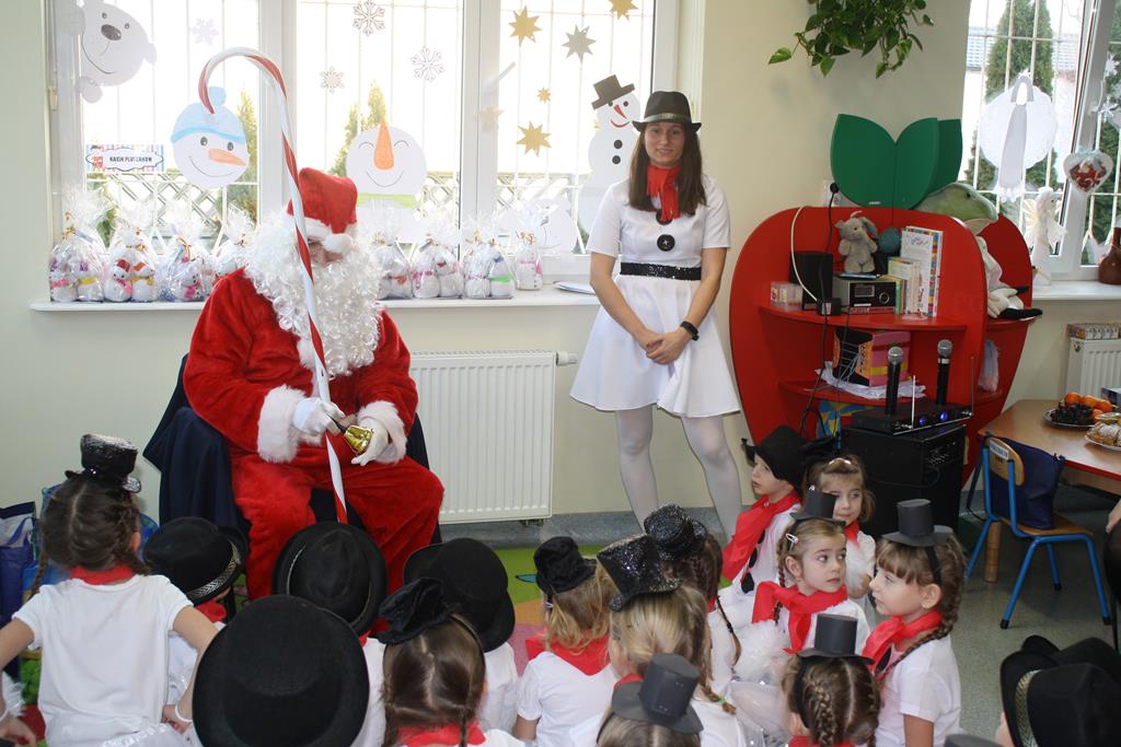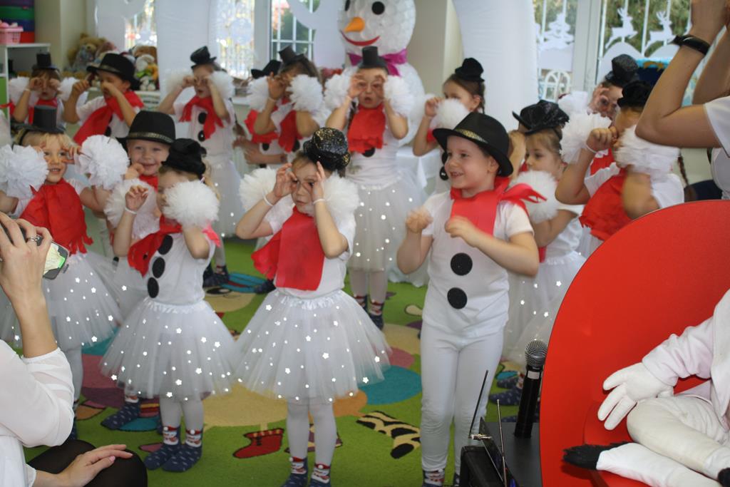 Przedszkolaki zaprezentowały montaż słowno-muzyczny pt. „Co słychać u bałwanków”, zaśpiewały piosenki o bałwankach oraz wyrecytowały wierszyki. Zgodnie z tradycją Świąt Bożego Narodzenia nie zabrakło też kolędy „Tryumfy Króla Niebieskiego”, którą dzieci zaśpiewały oraz wykonały do niej układ choreograficzny. Duże brawa rodziców wzbudził taniec „Bałwankowy rap”. Po obejrzeniu występów rodzice otrzymali od swoich dzieci prezenty wykonane wcześniej, własnoręcznie, podczas warsztatów świątecznych w Domu Kultury w Golinie. Tradycyjnie dzieci odwiedził Mikołaj, przynosząc dla każdego z nich prezent. Radość z podarunków była ogromna.