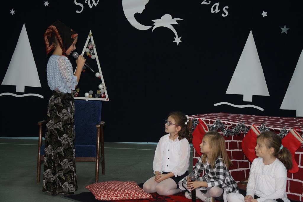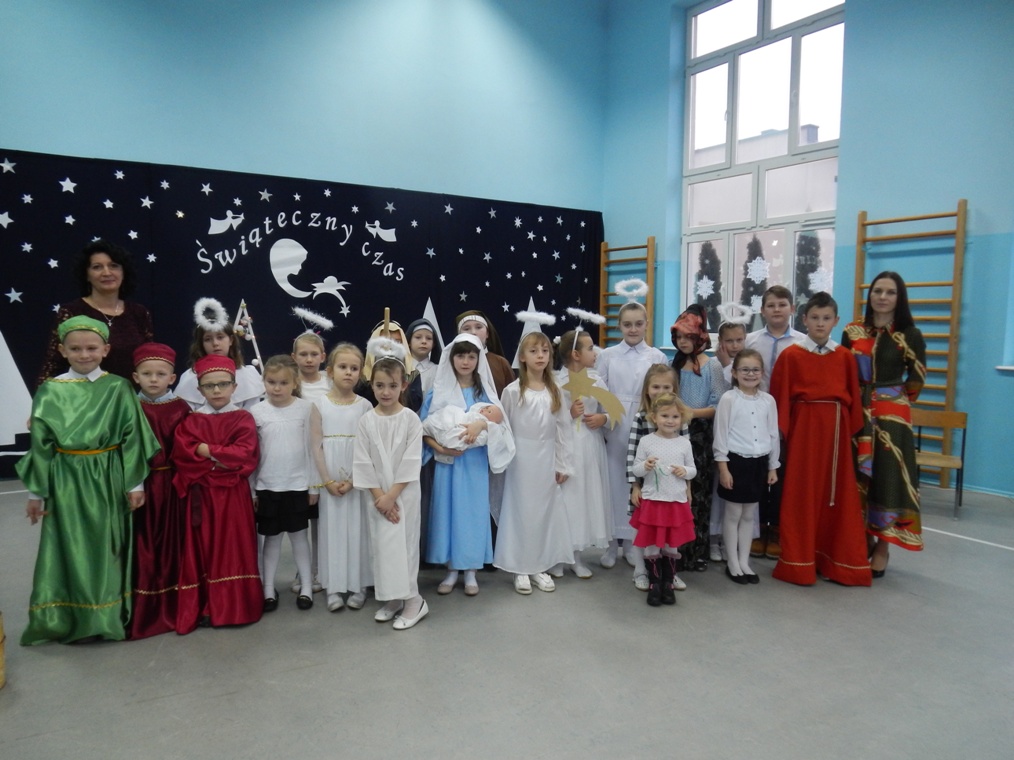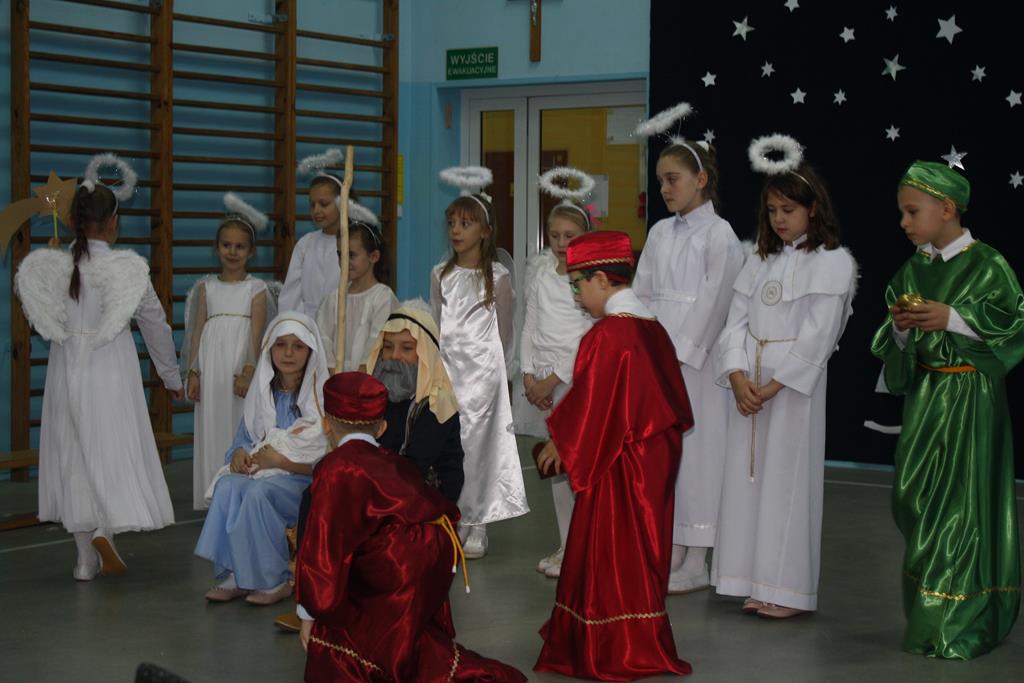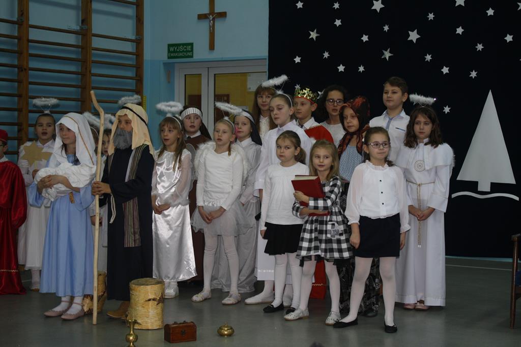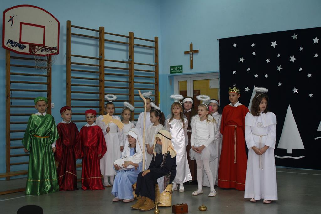 Przedstawienie w tym roku nosiło tytuł: „ Jak to jest z tymi świętami?”. Dzięki dokładnemu opisowi z Ewangelii świetego Mateusza, i Łukasza, który odczytała wszystkim „ babcia Wiktoria” publiczność po raz kolejny mogła przeżyć historię Maryi i Józefa od momentu Zwiastowania w Nazarecie do momentu szczęśliwych narodzin w Betlejem. Do nich i małego Jezusa przybyli pasterze oraz trzej mędrcy, którzy złożyli Dzieciątku pokłon i dary. Całość przedstawienia, pokazująca scenki z życia nowonarodzonego Dzieciątka, pasterzy, Heroda, mędrców oraz aniołów przeplatana była scenkami z życia trzech małych dziewczynek, które podczas rozmowy z babcią, próbowały się dowiedzieć dlaczego Święta Bożego Narodzenia są tak ważne dla każdego z nas. O dobrą atmosferę i miłe doznania wizualne oraz słuchowe zadbali zaś zdolni aktorzy – tutaj uczniowie klasy I i II oraz wokalistki- Alicja i Wiktoria (z klasy VIII) oraz instrumentaliści Michalina( z klasy IV) oraz Krzysztof ( z klasy VII) .